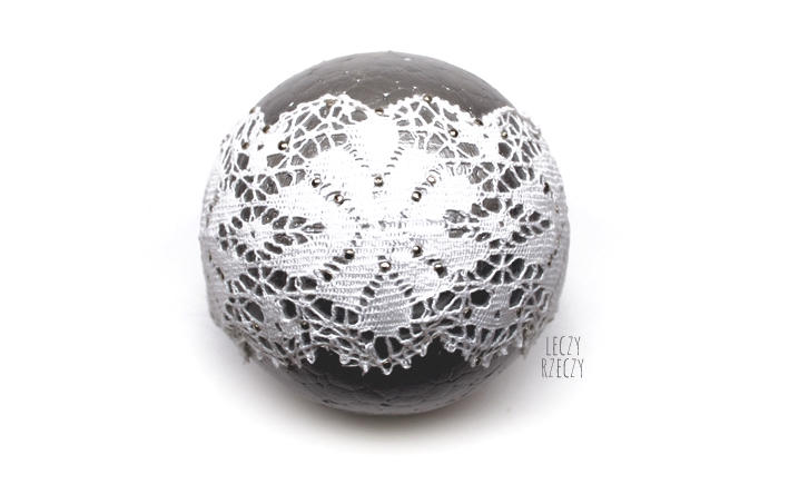 3. Górę i dół bombki (miejsca bez koronki) smarujemy klejem i obsypujemy brokatem. Po wyschnięciu kleju warto dodatkowo zabezpieczyć brokat np. lakierem do włosów.