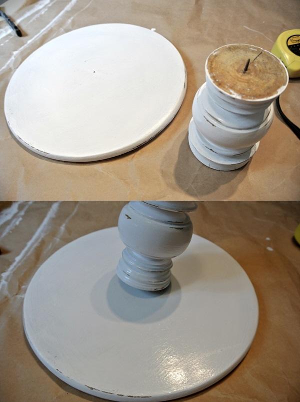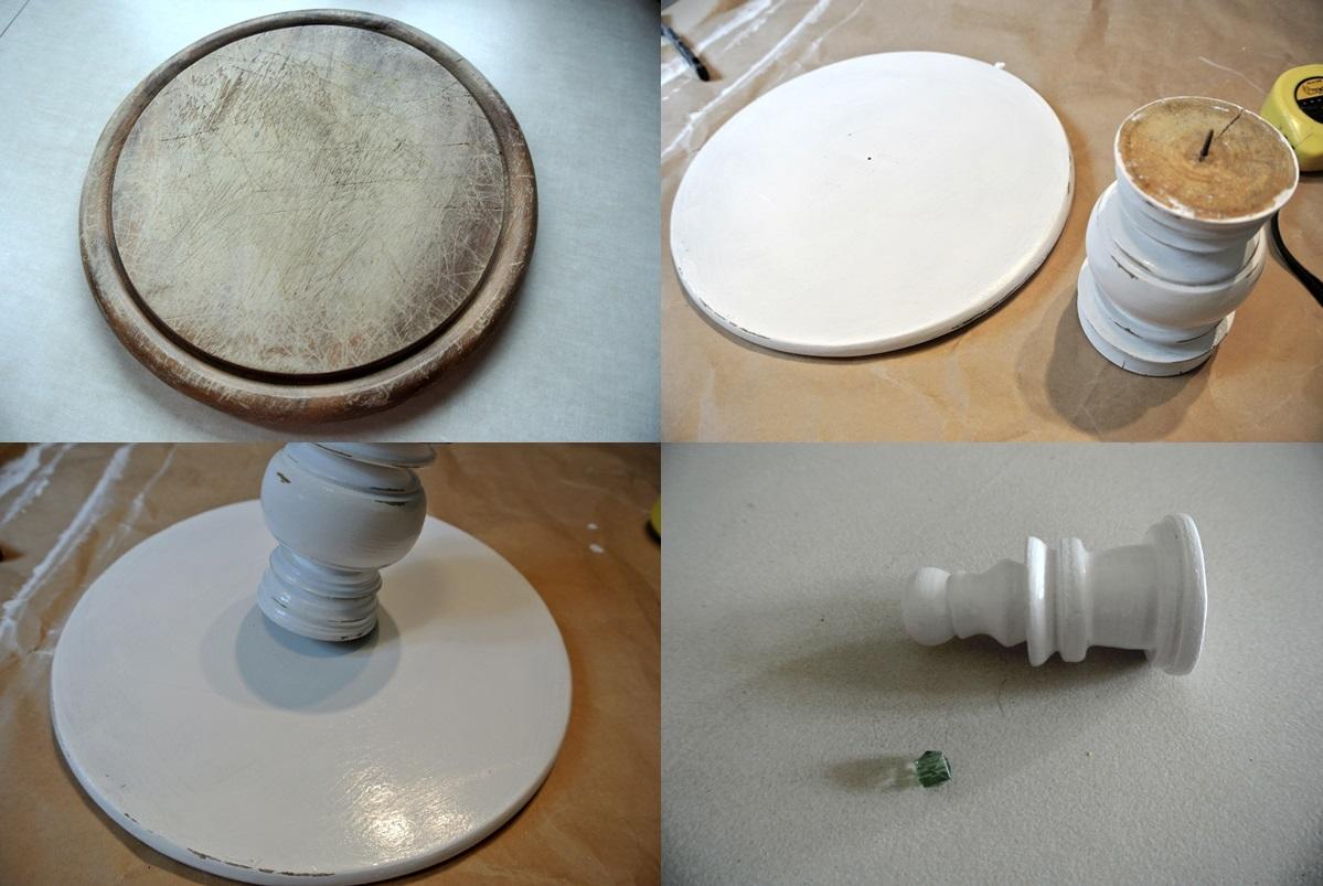 1. Czyścimy i malujemy na dowolny kolor deskę, stary świecznik i końcówkę od karnisza.