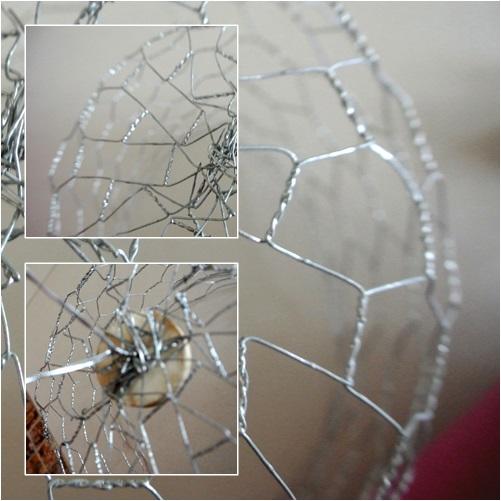 6. Przez górę siatki przewlekamy drucik i ściągamy go mocno. Kształt klosza modelujemy na misce, doniczce lub czymś o ładnych kształtach.