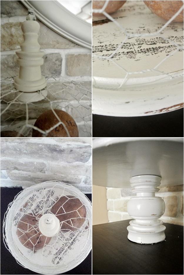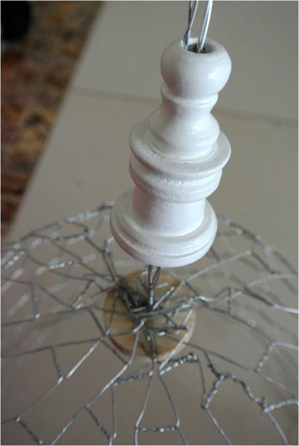 7. Teraz zabieramy się za zakrycie nierówności na górze klosza. Wykorzystałam do tego końcówkę karnisza, drucik i drewniane kółko. Kółko zakrywa nierówności od spodu, natomiast końcówka karnisza z góry.