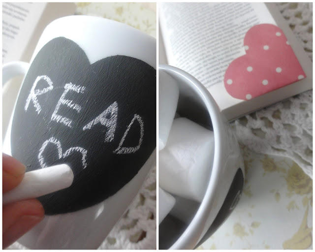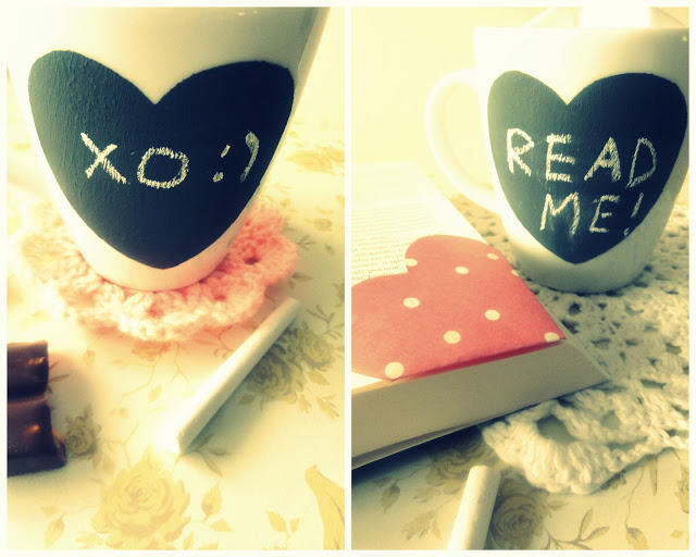 Na folii samoprzylepnej odrysowujemy kształt, który nam się podoba (np. serduszko). Wycinamy, tworząc w ten sposób szablon, który naklejamy na kubek. Teraz już tylko pozostaje naniesienie farby tablicowej. Wystarczą dwie warstwy w odstępie 5-godzinnym.