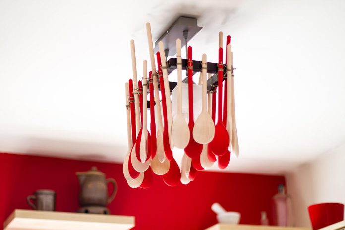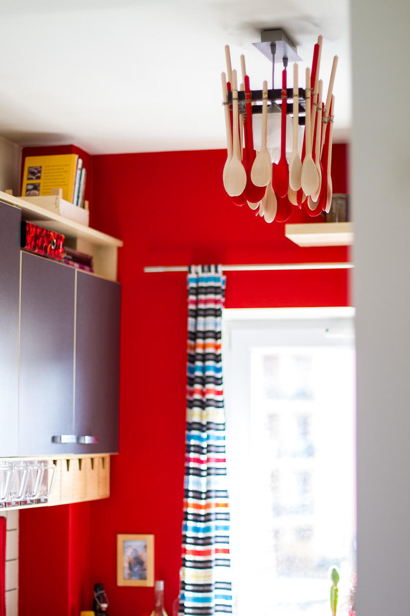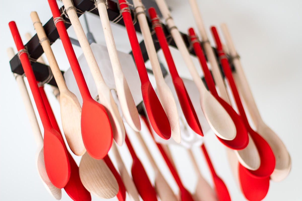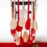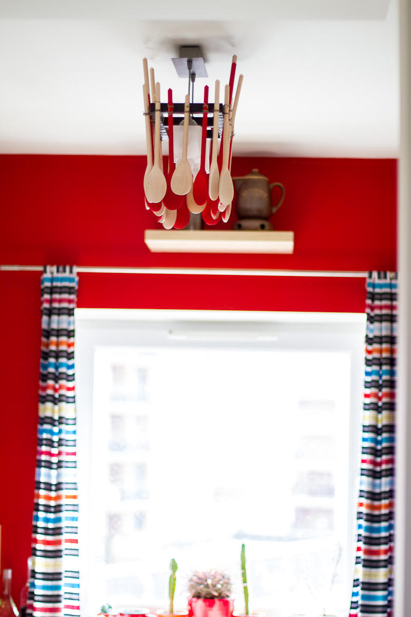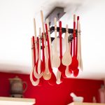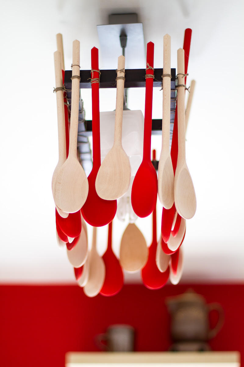 Mocowanie łyżek jest dość ryzykowne (sznurki), ale jak dotąd nic nikomu na łeb nie spadło i żyjemy w przekonaniu, że stan ten się utrzyma. Dla efektu wizualnego część łyżek została pomalowana na czerwono.