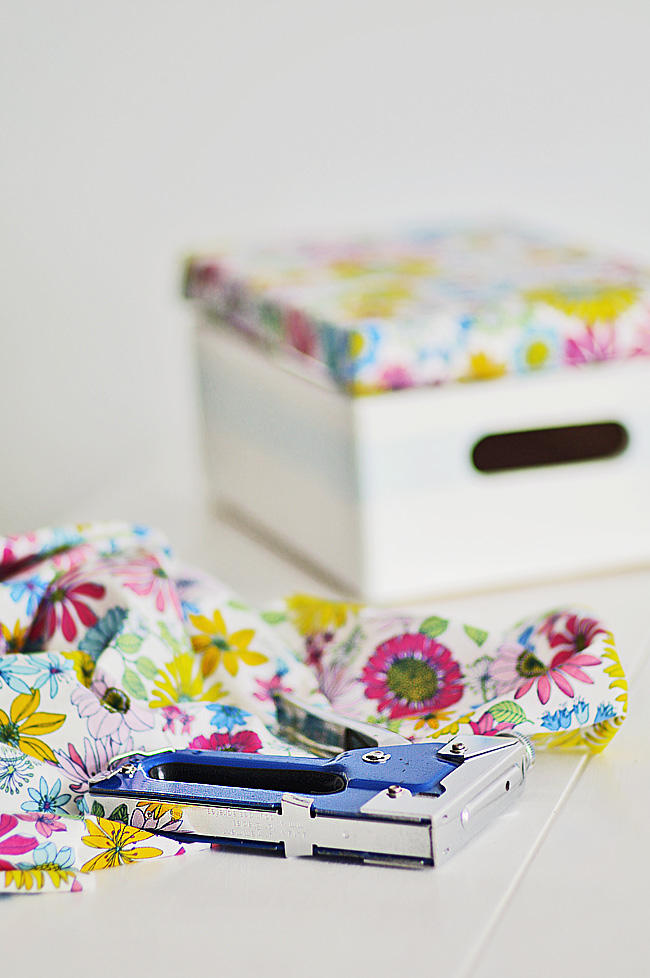 Materiał docinamy do wielkości wieka wraz z bokami + zakładka na podwinięcie. Jak juz materiał zostanie docięty, na jego lewą stronę przykładamy wieko wierzchnią stroną, tak aby znalazło się na samym środku materiału. Następnie nacinamy materiał lekko na rogach do wysokości boku wieka. Trzeba pamiętać też o wycięciu w materiale miejsca na zawiasy! Zakładamy materiał na boki i od wewnętrznej strony mocujemy zszywaczem. Polecam zacząć od krótszych boków i dobrze naciągnąć materiał, gdy będziemy mocować drugi równoległy bok.