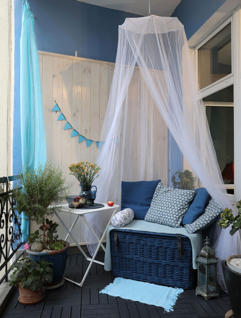 Aby stworzyć urokliwy i słoneczny zakątek do dionizyjskiego relaksu, należy przede wszystkim zadbać o porządek i ład na balkonie. Żadna to przyjemność pić poranną kawę i marzyć o greckich wyspach przy piętrzących się niepotrzebnych przedmiotach. Meble powinny raczej ograniczyć się do wygodnych foteli, leżaków, stolika i krzeseł. Jeśli pozwala nam na to przestrzeń, dobrym pomysłem jest zamontowanie hamaku lub plecionego siedziska-huśtawki. Meble na pewno warto udekorować poduszkami, kocami w marynistyczne wzory. Stary, ale ukochany, wiklinowy kufer, może z powodzeniem spełnić rolę wygodnego siedziska, jeśli nadamy mu odpowiedni kolor, położymy miękkie poduszki. Dodatkowego śródziemnomorskiego akcentu doda mu zawieszony nad nim baldachim. Dla miłośników wszelkiego rodzaju ażurowych konstrukcji, dobrym rozwiązaniem jest zawieszenie drewnianej ścianki. Nie musi być to antyczny, bogato rzeźbiony parawan, wystarczy klasyczna, prosta forma, która z powodzeniem spełni również praktyczną funkcję, przykładowo zakryje ścianę, na której widać ubytki, zadrapania, obtłuczenia. Przy zastosowaniu drewna należy pamiętać o odpowiedniej ochronie materiału przed negatywnym działaniem czynników atmosferycznych. Kolorystyka na ścianach powinna być utrzymana w błękitach, bielach, szarościach, z ciemniejszymi odcieniami na meblach, czy dodatkach. Jeśli nie do końca czujemy się dobrze w pielęgnacji roślin, ale lubimy zapach kwiatów, ziół, postawmy na popularne i łatwe w uprawie pelargonie, czy rozmaryn, tymianek, bazylię, które również z powodzeniem odtworzą śródziemnomorską aurę.