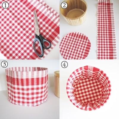 2. Ze ścierki kuchennej wytnij kółko (trochę większe od średnicy pudełka) oraz pas większy o kilka centymetrów od wysokości pudełka. Zszyj razem. Wyłóż materiałem pojemnik i wywiń mankiet na zewnątrz pojemnika.