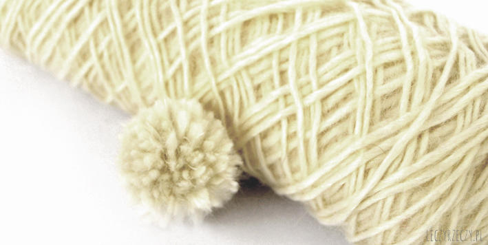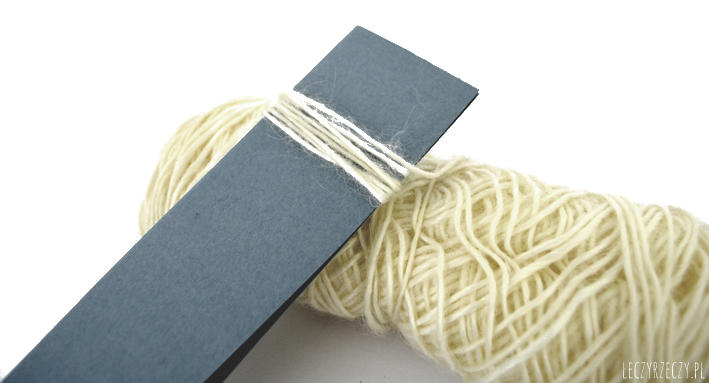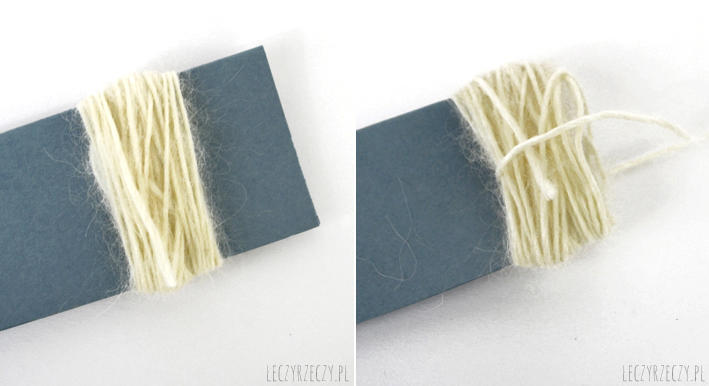 2. Przekładamy wokoło wszystkich nici odcięty wcześniej kawałek włóczki. Całość ostrożnie zdejmujemy w tektury i związujemy bardzo mocno. W przeciwnym wypadku nasz pompon nie będzie miał ładnego, okrągłego kształtu.