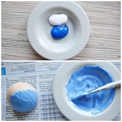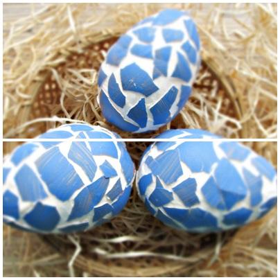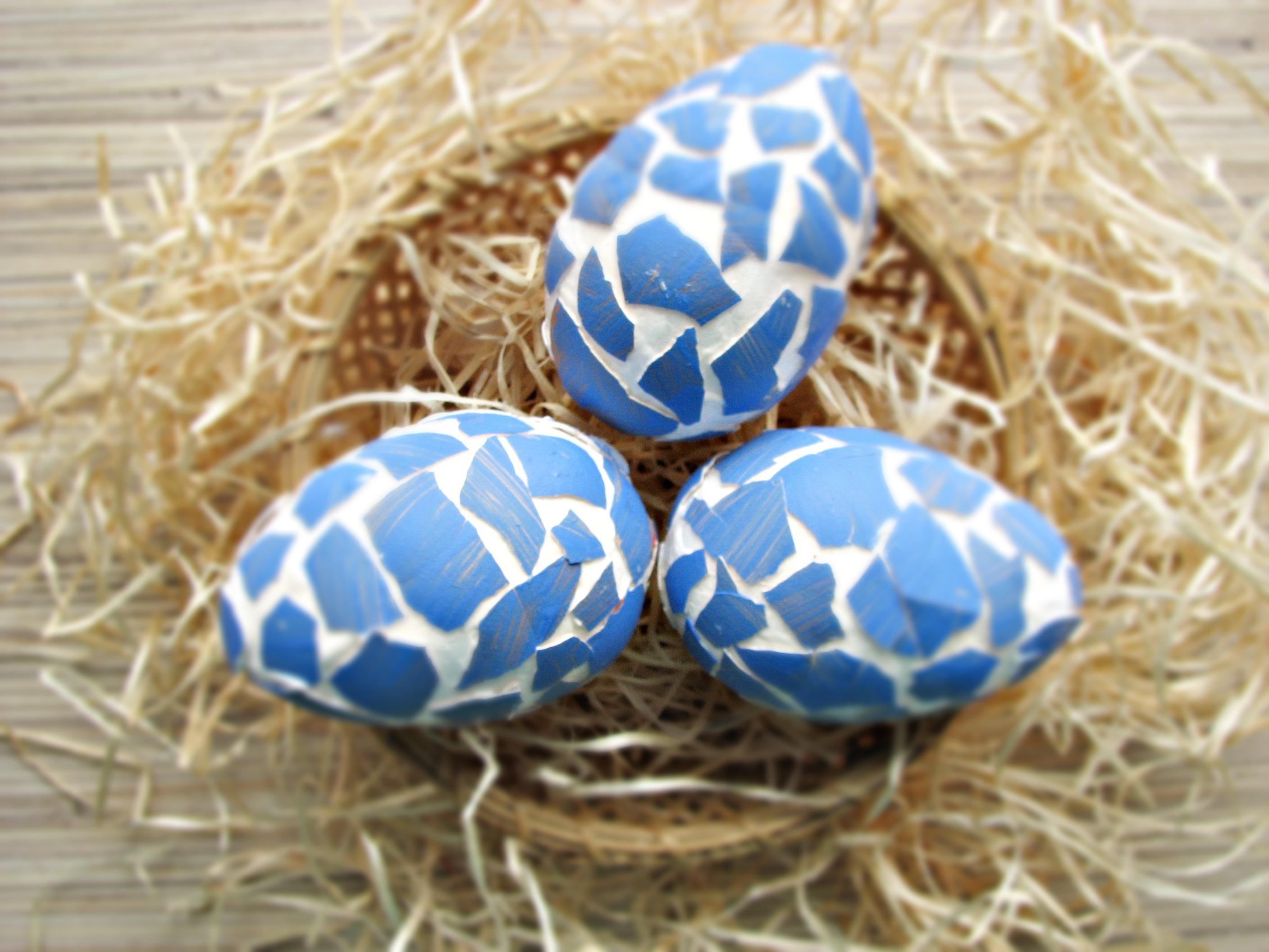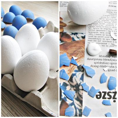 3. Połam skorupki na małe kawałki i przyklejaj do jajka ze styropianu, albo do pomalowanej na biało wydmuszki.