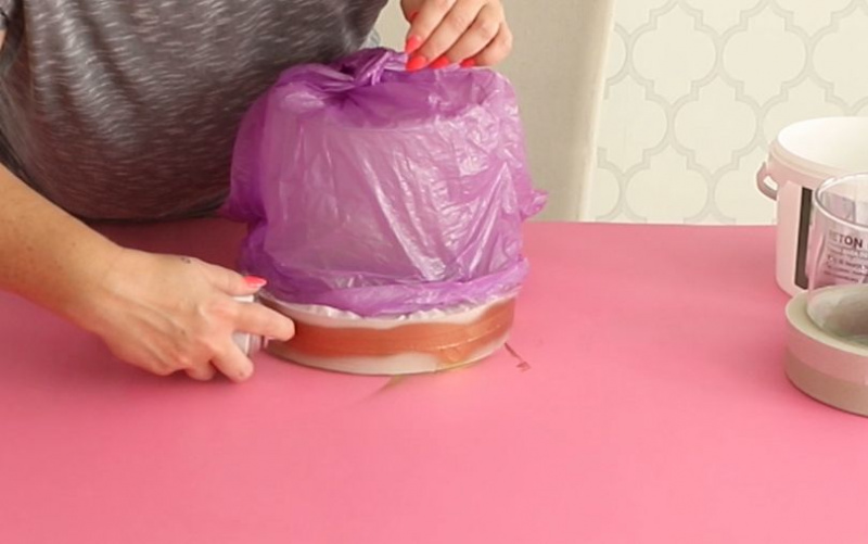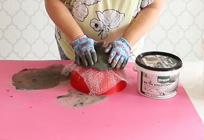 4. Na odwróconą miskę nałóż folię bąbelkową, a na jej wierzch – uformowaną wcześniej masę betonową. Przyłóż bąbelki także na wierzch, dociśnij i pozostaw do wyschnięcia.