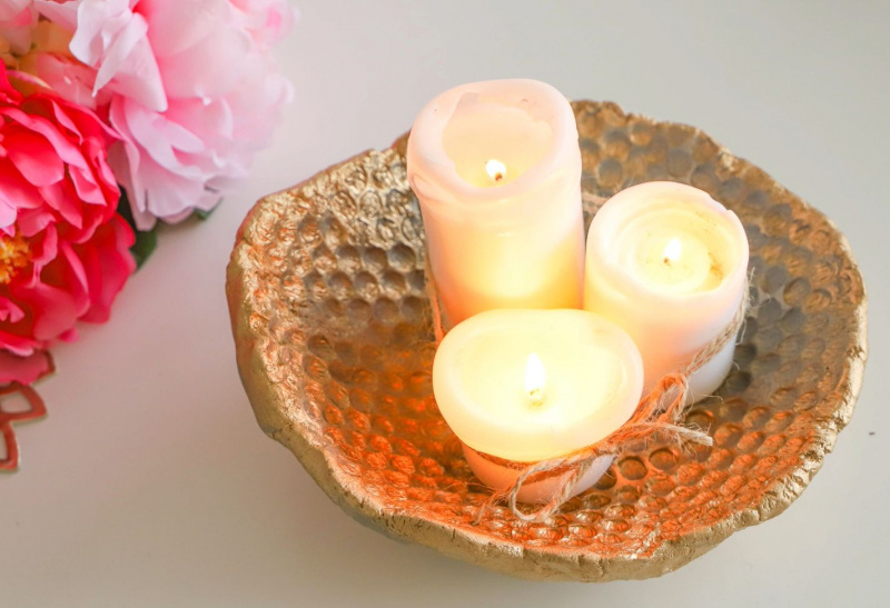 7. Ciesz się własnoręcznie zrobioną misą, którą możesz wykorzystać albo jako podstawkę do świec lub też designerską tacę na stół. Pamiętaj, że stworzona masa jest odporna na słońce, wilgoć i mróz, więc możesz ją wykorzystać także na tarasie czy balkonie.