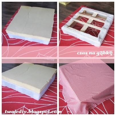 3. Wycięłam gąbkę do wielkości palety. Materiał przycięłam zostawiając spory margines na zakładkę.