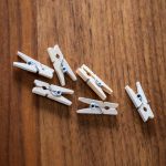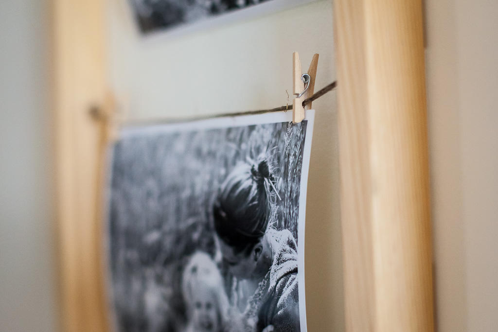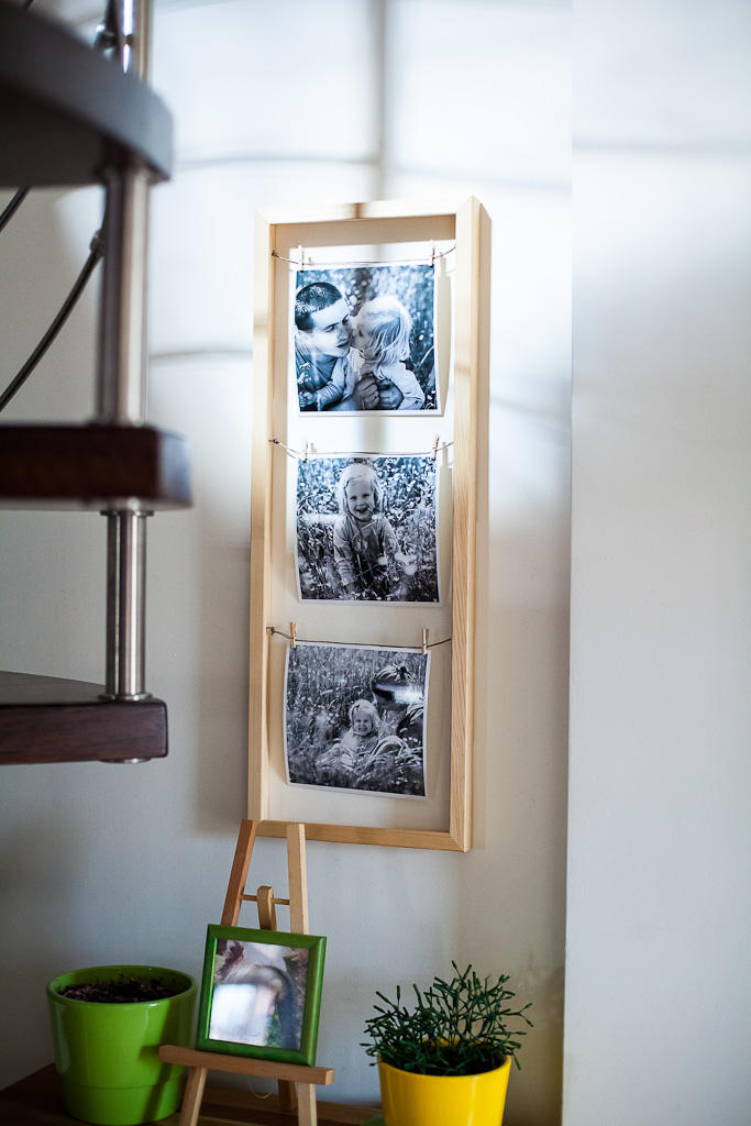 Jako, że zdjęcia zajmują ważną rolę w naszym dorobku materialnym: postanowiłam „palnąć” kilka tu i tam, przy użyciu spinaczy, które uwielbiam. Tym razem klamerki występują w wersji mini i tworzą dzieło wraz ze sznurkami, gwoździkami i drewnianymi ramkami. Wszystkie te elementy sprawnie połączone – doskonale prezentują zarówno się jak i zdjęcia na ścianie.
