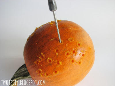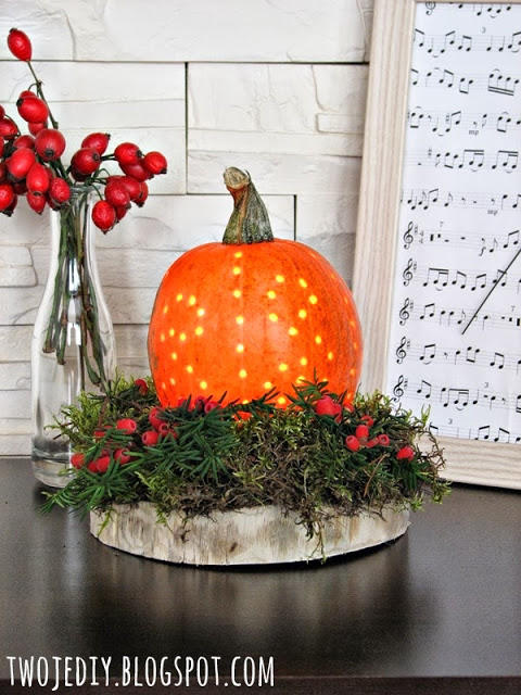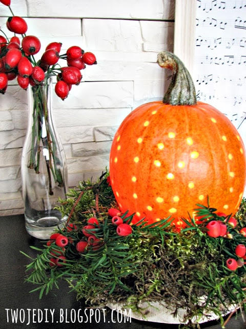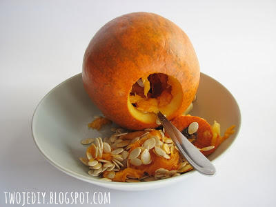 Na zakupach, na targowisku Kasia dojrzała przepiękną, nie za wielką, idealnie proporcjonalną dynię. Nie mając na nią planu, kupiła i przyniosła do domu. Kilkanaście dni stała jako ozdoba sama w sobie. Pewnego ranka wpadła jednak w szał twórczy, zrobiła kilka nowych projektów i odciążyła swoje szare komórki, żeby już nie musiały o tych pomysłach myśleć. Oto efekt działania z dynią.