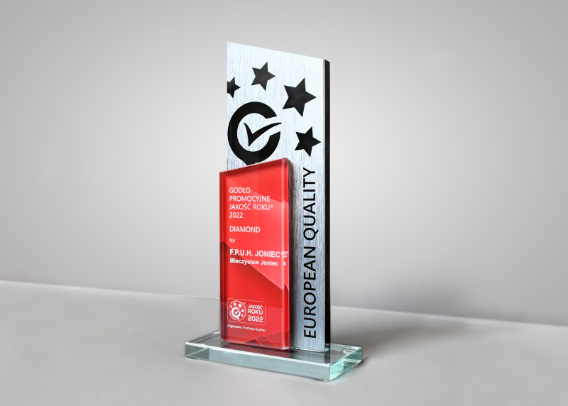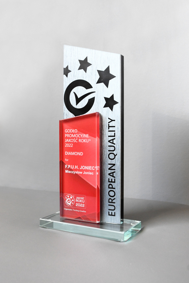 W dniu 12.12.2023 r. w Warszawie odbyła się uroczysta Gala podsumowująca 26. edycję Konkursu Polskiej Nagrody Jakości, podczas której F.P.U.H. JONIEC® Mieczysław Joniec otrzymała nagrodę Godło Promocyjne JAKOŚĆ ROKU® 2022 DIAMOND.