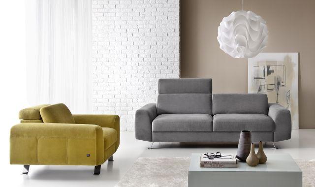 Miękkie pikowania łączą się tu ze zdecydowaną linią masywnej bryły. Ukośne, chromowane nogi unoszą proste, geometryczne siedziska. Doskonale wyważone proporcje siedziska i oparcia, szerokie, miękkie podłokietniki i długie, unoszone jednym ruchem zagłówki oferują komfort, którego nie sposób nie docenić. Funkcja spania i wygodny pojemnik na pościel to detale, które dopełniają całości.