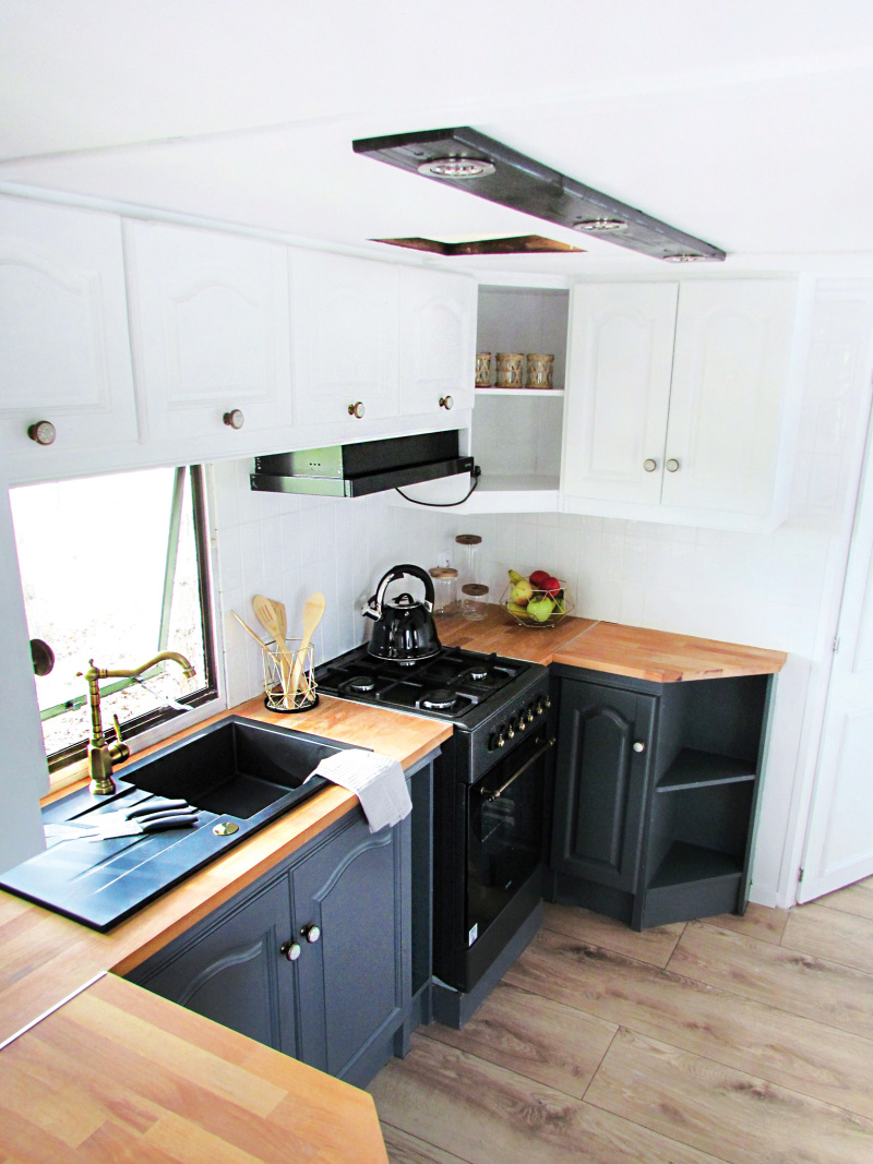 By kuchnia zyskała bardziej rustykalny charakter wprowadzono drewniane elementy w naturalnym, ciepłym odcieniu. Dlatego na szafkach pojawił się nowy, drewniany blat, który harmonizuje z podłogą. Drugim sposobem na ocieplenie wnętrza jest zieleń widoczna na zewnątrz domku. Dlatego nad zlewem znajduje się uchylne okno, przez które widać naturalną roślinność. By zyskać dodatkowe miejsce na przechowywanie zaprojektowano praktyczne półki narożne na drobiazgi oraz głębokie narożne szafki, w których można umieścić rzadziej wykorzystywane sprzęty czy naczynia.