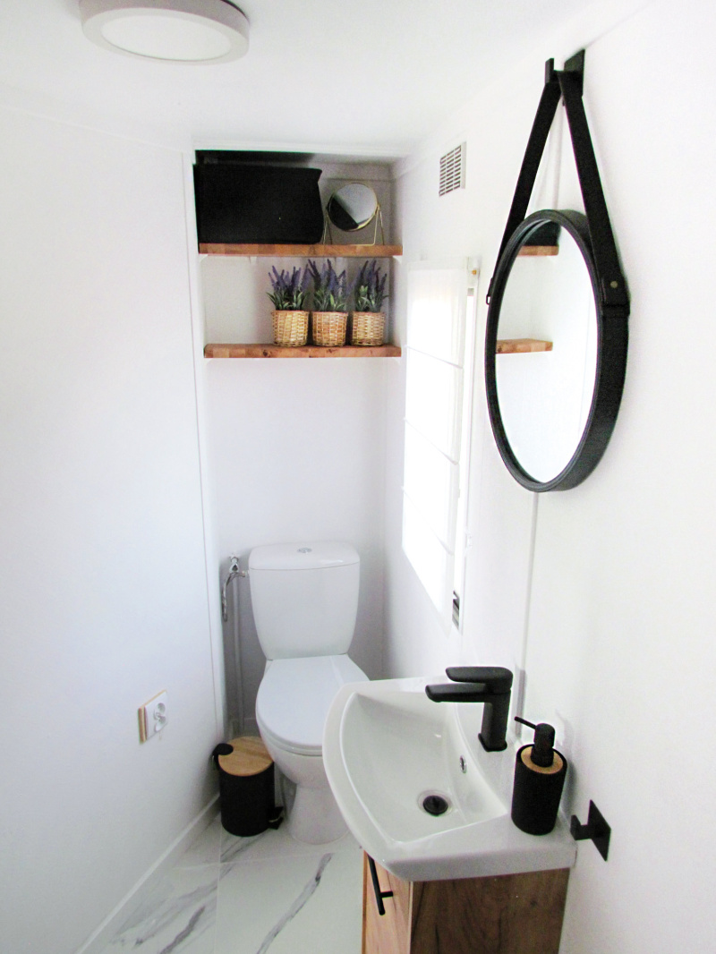 Drewniane półki nad toaletą podkreślają naturalny charakter wnętrza. Małe, okrągłe lusterko w złotej ramce idealnie współgra z czernią i bielą, dodając pomieszczeniu elegancji. Pod umywalką zmieściła się nowa, nieduża szafka, stanowiąca z nią komplet. Ciekawym akcentem przyciągającym wzrok jest zasłonka pod prysznicem w geometryczne wzory.