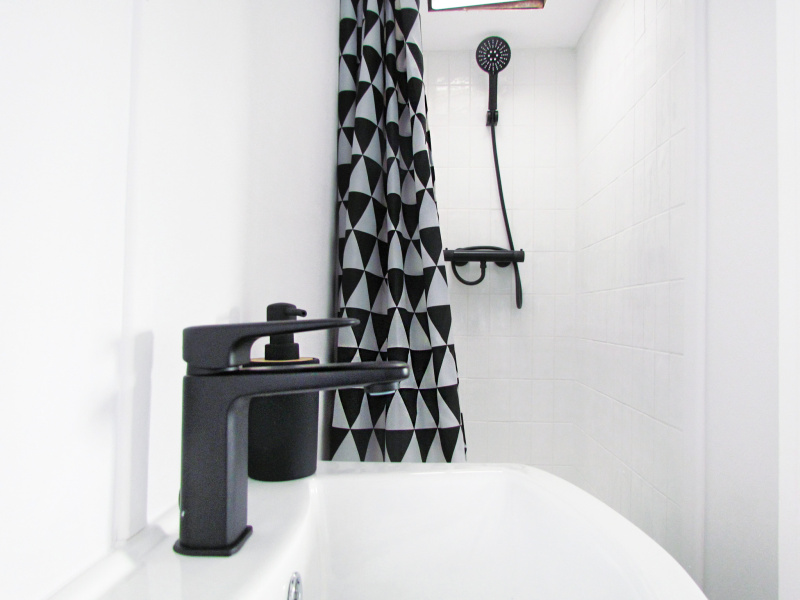 To kontrastowe zestawienie barw pasuje do każdego wnętrza. Na białym tle czarna bateria kranowa i prysznicowa wyglądają czysto i estetycznie. W czerni utrzymane są również mniejsze akcesoria dekoracyjne, takie jak wieszak na papier toaletowy i dozownik mydła. Idealnym dopełnieniem jest miks tych kolorów na jednej fakturze, czyli czarno-biała zasłonka prysznicowa w geometryczne wzory.
