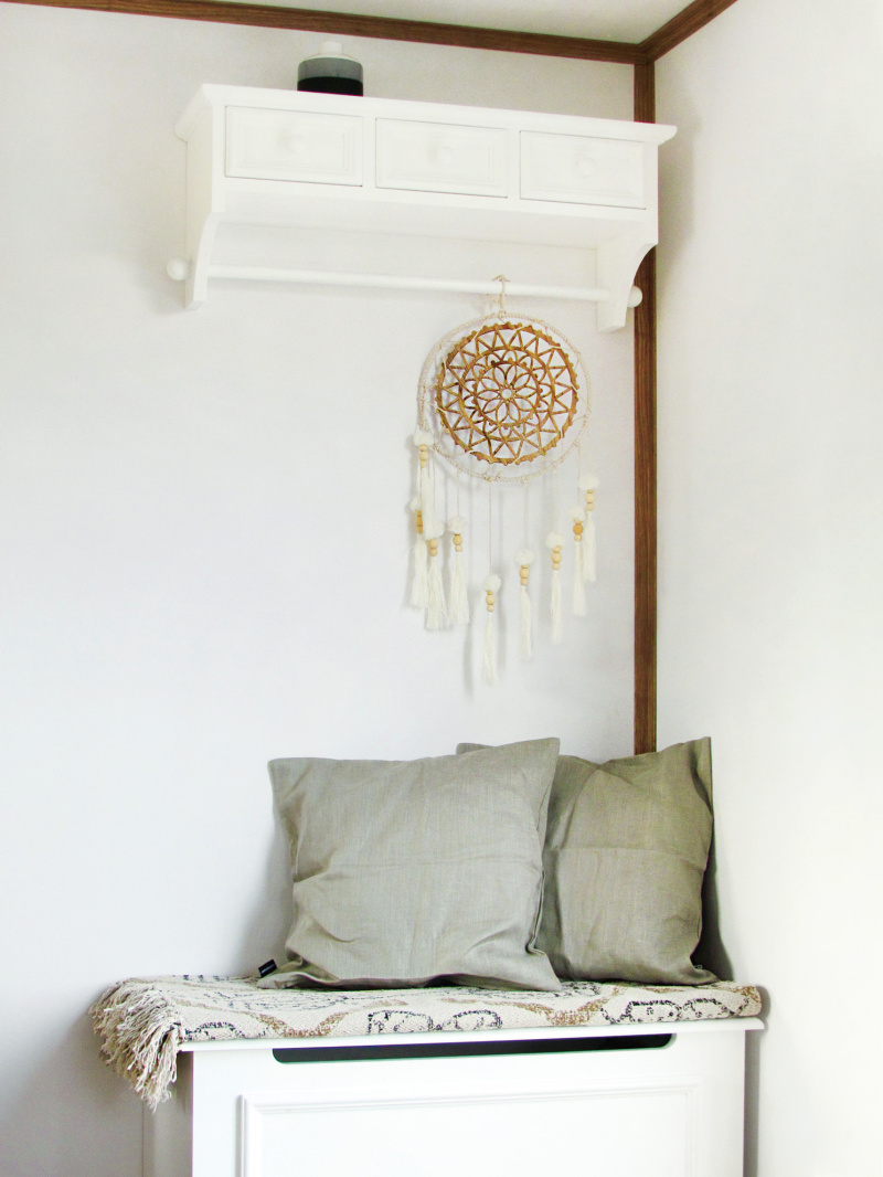 Miękkie, dekoracyjne poduszki, m.in. szara, okrągła z ozdobnym guzikiem w zestawieniu ze wzorzystymi narzutkami w stonowanych kolorach sprawiają, że wnętrze staje się bardziej przytulne. Połączenie różnych deseni i materiałów wygląda niezwykle elegancko, a jednocześnie dodaje całości nieco artystycznego charakteru. Oprawa okien w postaci półprzezroczystych zasłon nadają pomieszczeniu lekkości. Wszystkie dekoracyjne tekstylia znajdziesz pod kodem QR i w aplikacji mobilnej insbuy.