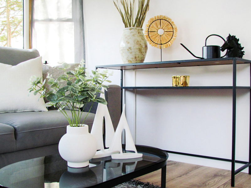 Dłuższą ścianę obok kanapy zdobi drewniana konsola w czarnej, metalowej oprawie, która dodaje jej elegancji. Dodatkowa półka to sposób na uporządkowanie różnego rodzaju drobiazgów, książek i magazynów. Charakteru całemu wnętrzu dodają wyeksponowane na konsoli dodatki, takie jak oryginalna, czarna głowa konia, duży wazon w pastelowe wzory, stojąca ozdoba z trawy morskiej oraz czarna konewka. Wszystko nawiązuje do stylu modern farmhouse. Okno za narożnikiem ozdabia lampka, a także szary, oryginalny wazon typu bubble ze szkła oraz klasyczne, czarne, metalowe świeczniki.