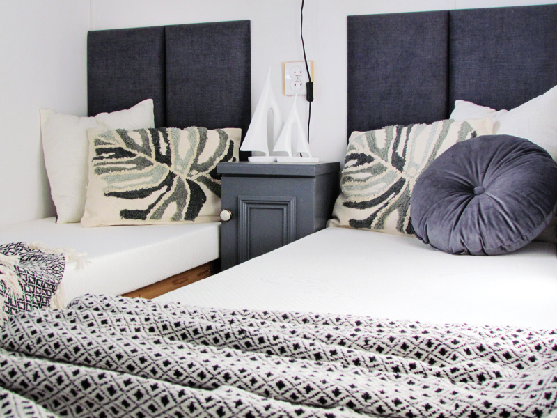 Domek ten miał początkowo wymagać tylko drobnych zmian kosmetycznych. Tymczasem po bardziej wnikliwym zbadaniu jego stanu okazało się, że konieczny był poważniejszy remont. Celem nowych właścicieli było stworzenie domku gotowego do wypoczynku, atrakcyjnego dla jak najszerszej grupy potencjalnych urlopowiczów. Stąd pomysł na wystrój w stylu modern farmhouse. W tym celu zachowano praktyczne szafy w sypialniach oraz zabudowę kuchenną, a zużyte już tapety zastąpiła czysta biel. Główna sypialnia została utrzymana w stonowanej kolorystyce, łączącej biel z beżem, a gościnna – w bieli i szarości. Ze względu na brak łóżek w pożądanych wymiarach, świetnym rozwiązaniem okazały się stelaże oraz tapicerowane panele na ścianach. Nieco przaśne materace zastąpiły nowe, utrzymane w bieli, która dodaje im świeżości. Całość ozdobiły nowe uchwyty oraz ciepłe, nowoczesne oświetlenie.