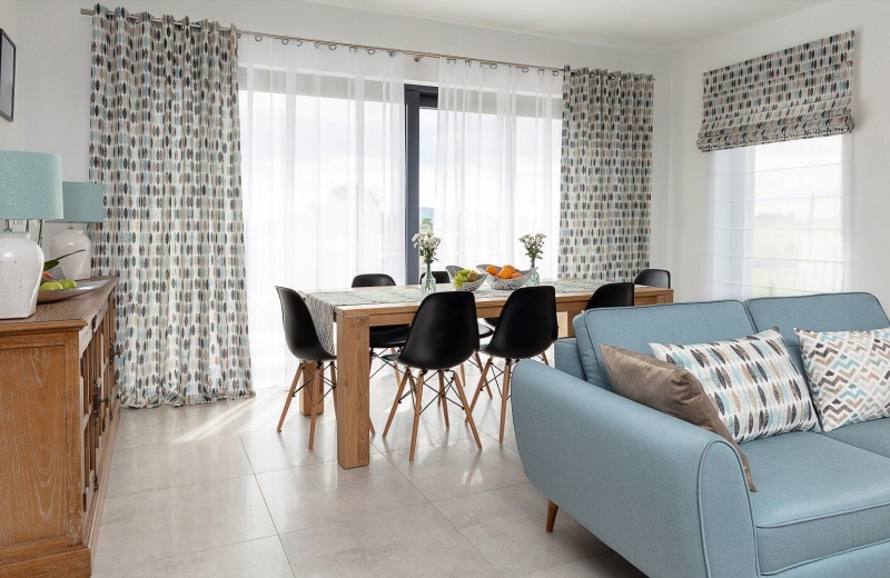 - wybierz kilka elementów z tej samej kolekcji – zasłony, rolety i poduszki z jednym motywem geometrycznym stworzą spójną całość. Znajdziesz je chociażby w kolekcji tkanin Modern lub Brooklyn, które oferuje Dekoria.pl;