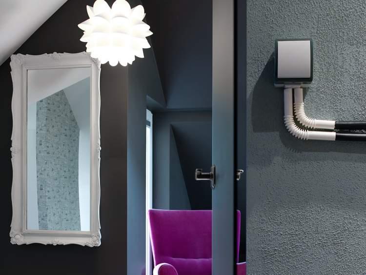 Szczególną rolę w zaprojektowanej kompozycji odgrywa umiejętne posługiwanie się detalem. Uwagę przykuwa przede wszystkim zastosowanie natynkowej instalacji i łączników produkowanych przez Kontakt-Simon. Takie rozwiązania – stosowane tradycyjnie w rzadziej odwiedzanej przestrzeni użytkowej – zostały mocno wyeksponowane, by trafnie dopełniać całość. To doskonały przykład strategii polegającej na zaakcentowaniu elementów, które do tej pory starano się raczej wpisać w pejzaż mieszkania tak, by nie rzucały się szczególnie w oczy. Jak widać, w dobrze przemyślanej aranżacji łączniki i gniazda natynkowe z serii Simon Protector stały się oryginalnymi, kubistycznymi detalami dekoracyjnymi, niepozbawionymi nowoczesnego postindustrialnego charakteru.