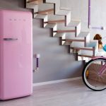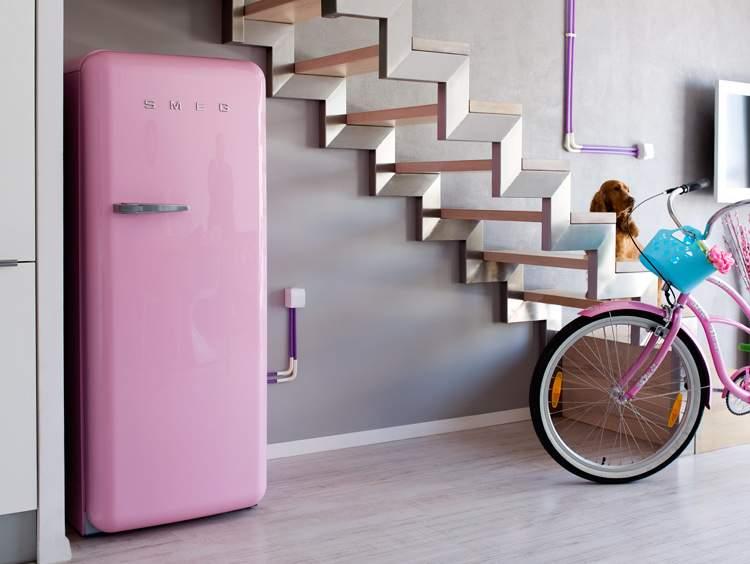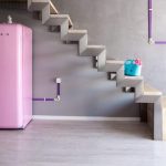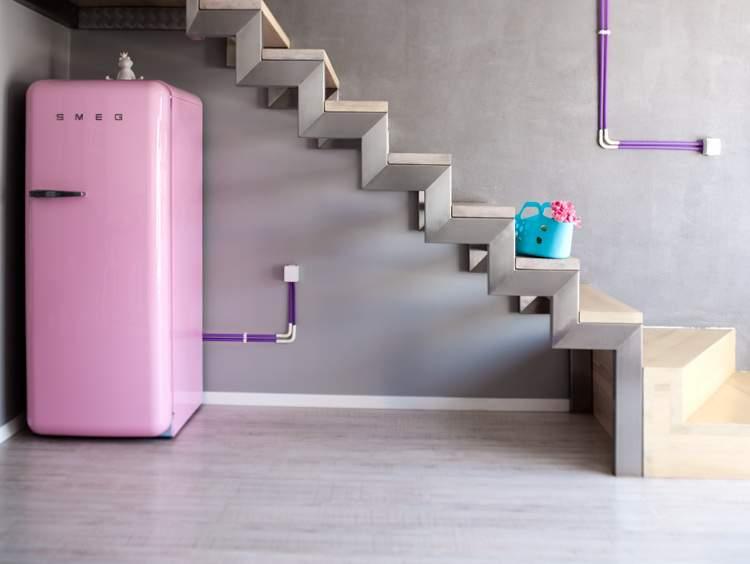 Dobry przykład stanowią popularne dziś schody pozbawione barierek i poręczy oraz znajdująca się pod nimi stylizowana na lata 50. kultowa lodówka firmy Smeg w nietuzinkowym różowym kolorze. Jak dowiodła projektantka Gaba Kliś, której aranżacje znane są ze śmiałego i swobodnego przełamywania konwencji, szary kolor ścian stanowi wyjątkowo dobre tło dla innych barw, umożliwiając zgrabną grę odważnymi akcentami kolorystycznymi. Kreując domowe wnętrze projektantka postawiła sobie za cel stworzenie modnego designu, dzięki odpowiedniemu zestawieniu charakterystycznych kształtów i kolorów.