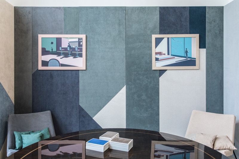 Zapraszamy do obejrzenia zdjęć Marka Swobody dokumentujących wystawę instalacji wykonanej z materiałów „TARA” Alcantara. Część wejścia do galerii Atelier Myszkowski została wyłożona panelami pokrytymi materiałami w kilku stonowanych odcieniach, całość układała się w geometryczną, strzelistą kompozycję. Dodatkowo na ścianach zaprezentowane zostały ilustracje Victora Cavazzioniego oprawione w ramy z materiałów „TARA”. Motywem przewodnim kadrów był człowiek umiejscowiony w konkretnym wnętrzu – apartamencie hotelowym, kawiarni, domu, lotnisku. Na każdym obrazie można było odnaleźć element wzoru „TARA”. Wystawie towarzyszyły też obiekty użytkowe jak fotele obite wersją tkaniny w beżowym odcieniu z czerwonym nadrukiem oraz film przedstawiający animację „TARA”. Mimo połączenia kilku odcieni tkanin wystawa była spójna i harmonijna. To niewątpliwie cecha charakterystyczna podkreślająca kreatywność i szerokie możliwości zastosowania materiału „TARA”.