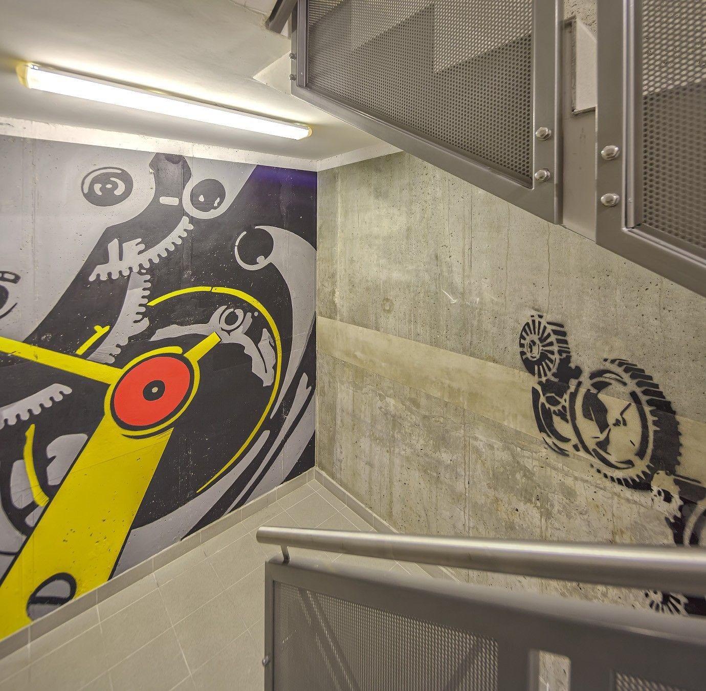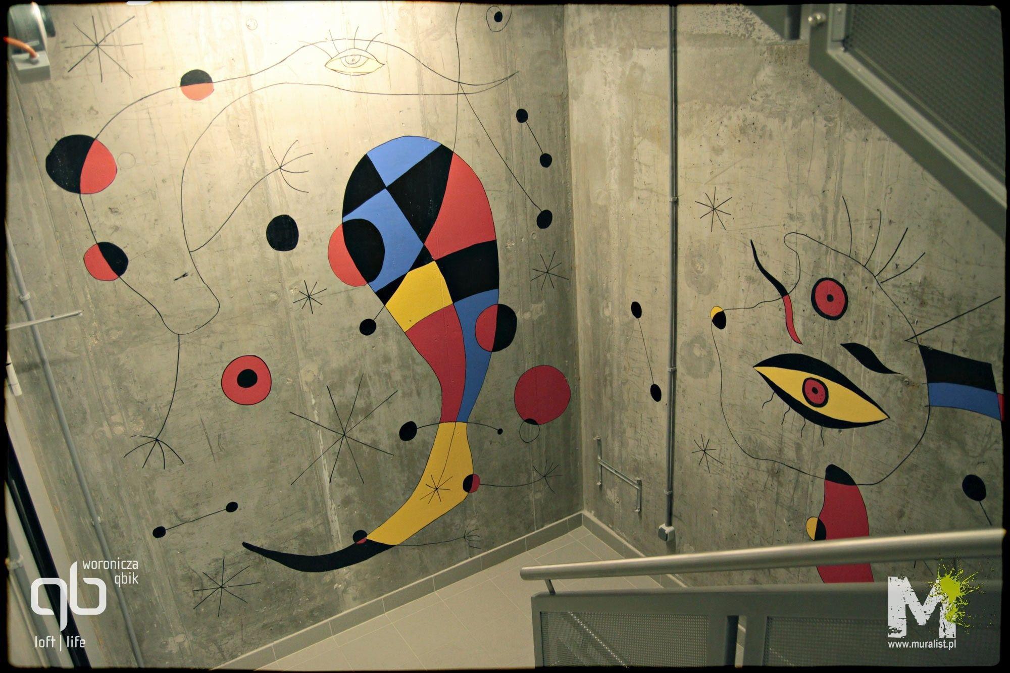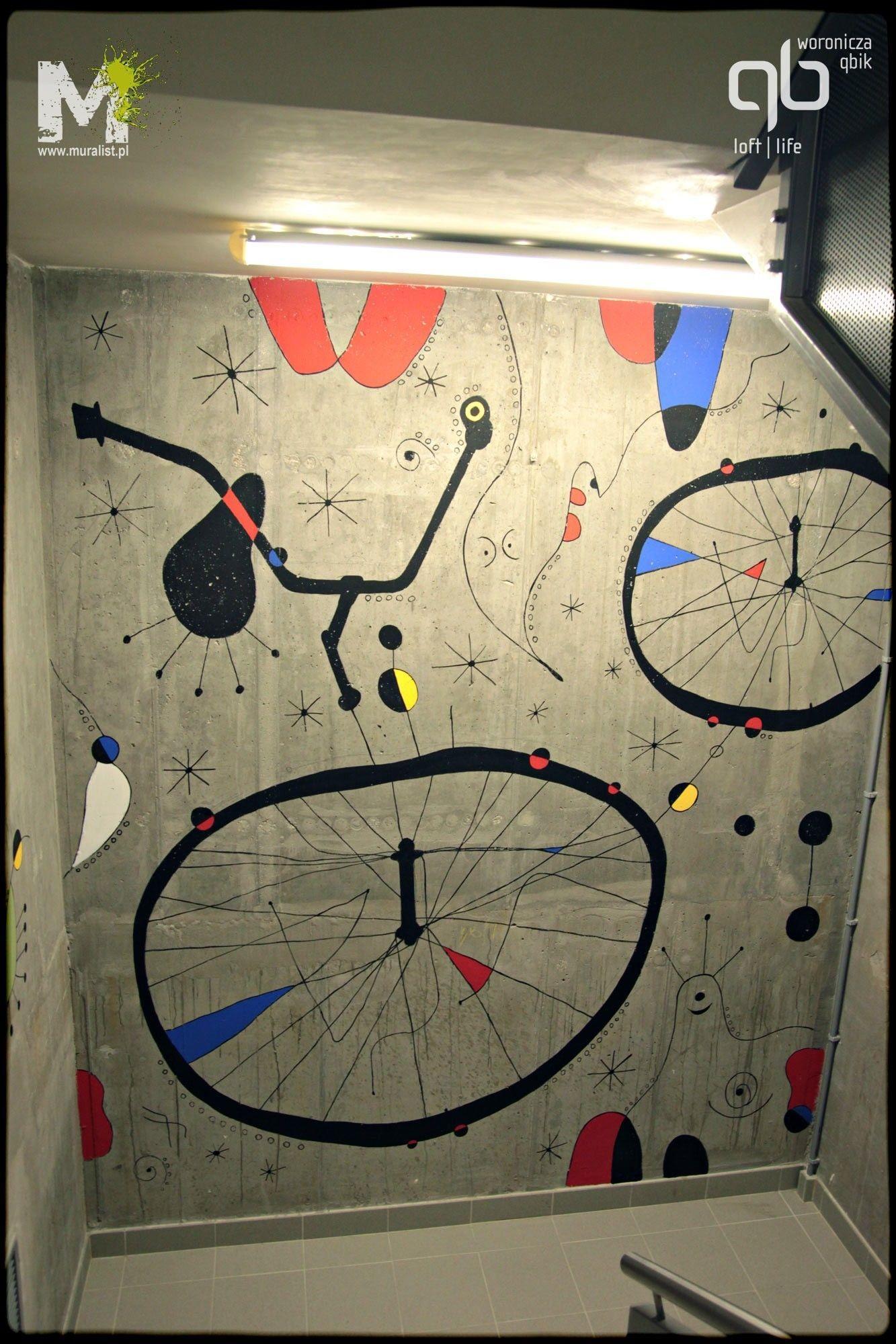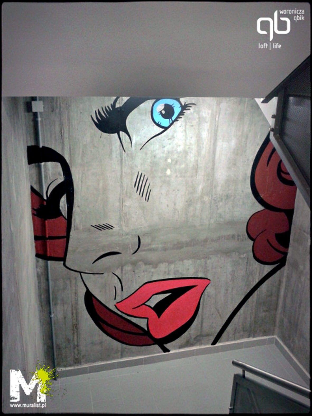 Pomalowano w sumie 350 ścian w o łącznej powierzchni około 3000 m2 – skala realizacji tego typu w Polsce jest jak dotąd niespotykana. Idealnie dopasowane do Woronicza Qbik murale stanowią dopełnienie loftowego genius loci Woronicza Qbik. Każda z 11 klatek została opracowana według własnego tematu przewodniego. Na surowych, betonowych ścianach 2 klatek schodowych i holi windowych Qbika znajdziemy inspirowane amerykańskim pop-artem motywy bliskie malarstwu Roya Lichtensteina, które tworzą rozpięty na 14 pięter komiks. Na innych ścianach powstały zestawienia prostych form i podstawowych barw w stylu Pieta Mondriana, a w jednej z klatek – malunki inspirowane abstrakcyjną twórczością Joana Miró kojarząca się z dziecięcymi rysunkami. Trzy klatki schodowe prezentują typowo street-artowe murale z motywami industrialnymi – tryby i maszyny wymalowane w technice graffiti świetnie współgrają z klimatem Qbika, a w malunki doskonale wpasowane zostały oznaczenia pięter z ciekawym krojem czcionek współgrającym z ich stylem. Na zasadzie kontrapunktu do „przemysłowej” stylistyki w innym miejscu pojawia się subtelny motyw brzóz i wzlatujących ptaków.
