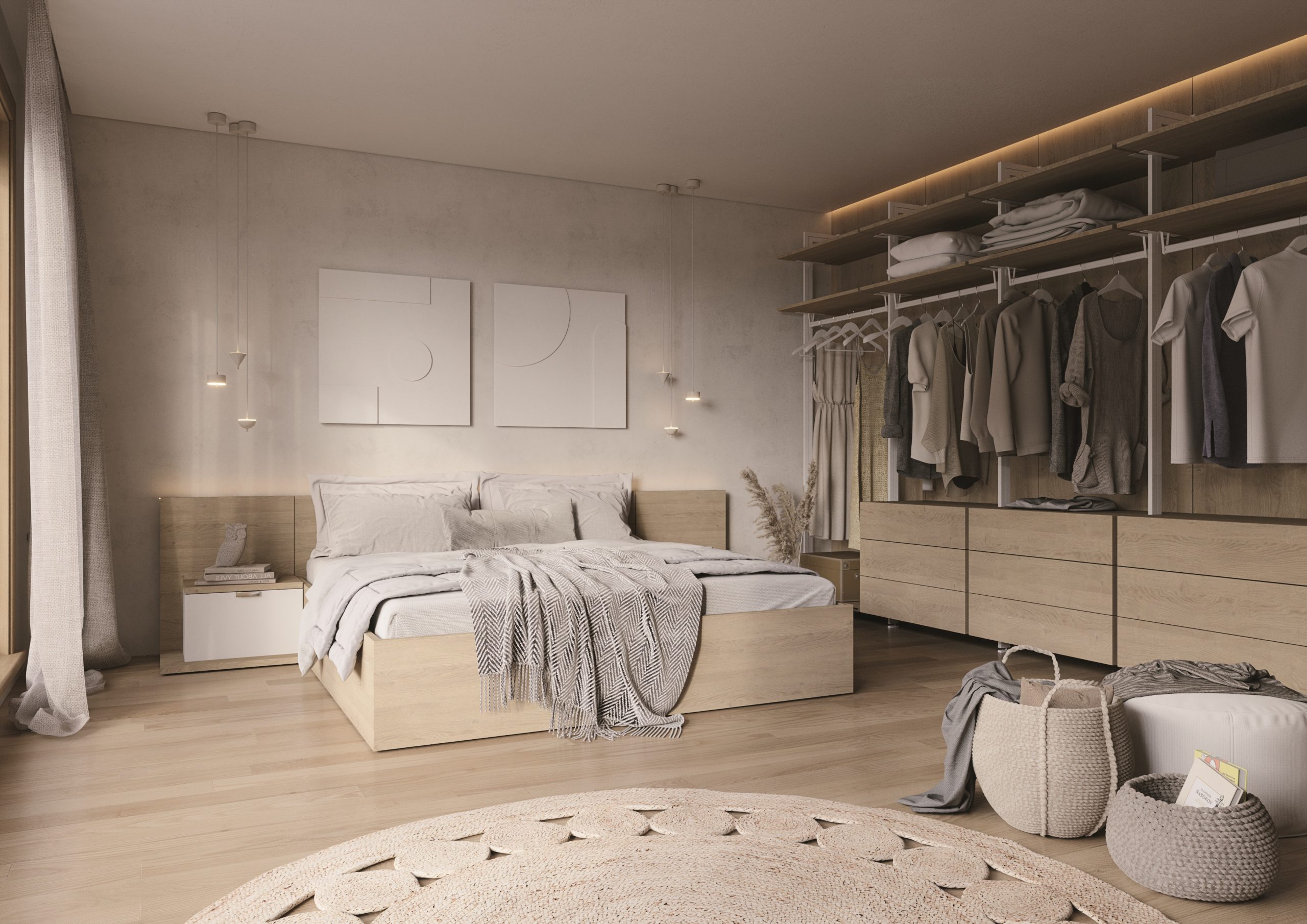 Dzięki temu garderoba staje się integralną częścią sypialni, a jednocześnie nie zaburza jej estetyki.