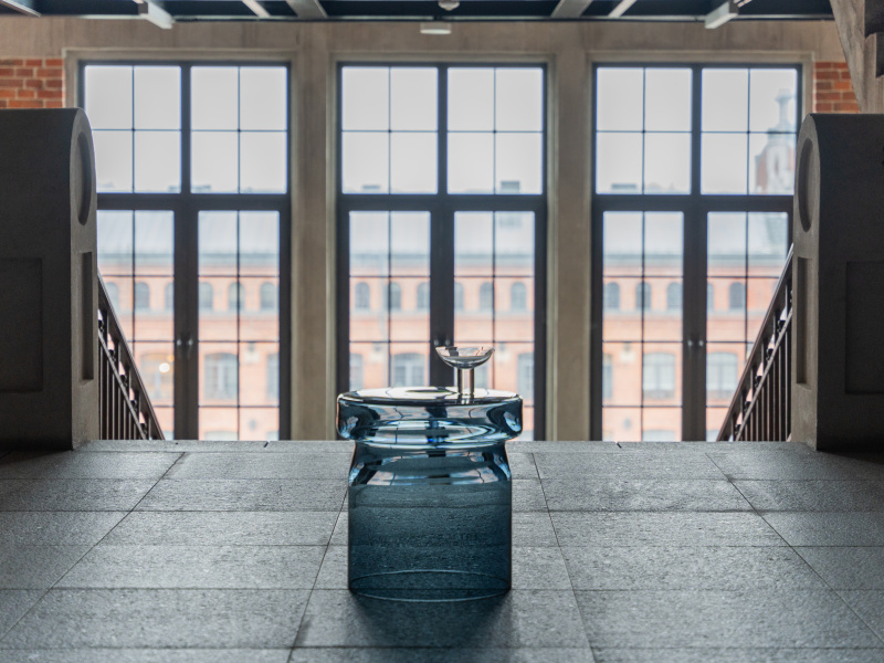 Ważącą ponad 20 kg porcję szkła umieszcza we wcześniej przygotowanej formie i na tym etapie obracając i jednocześnie wdmuchując powietrze, formuje kształt stolika.