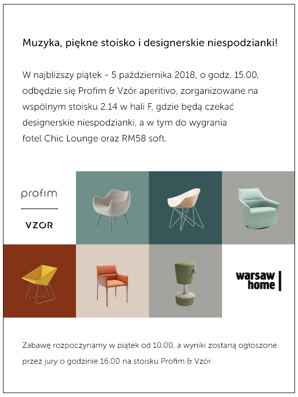 Wspólne stoisko Profim & Vzór to także obowiązkowy punkt na mapie targów, gdzie oprócz pięknego designu będzie można spotkać koneserów najlepszego wzornictwa oraz autorytety z branży. Dodatkową atrakcją będzie wydarzenie Profim & Vzór Aperitivo, które poprowadzi twórczyni OKK! design – Olga Kisiel-Konopka w akompaniamencie energetyzującego DJ-a. O podniebienia gości zadba restauracja Instalacje Art Bistro, a do wygrania w konkursie będą: ufundowany przez Profim fotel Chic Lounge i fotel RM58 Soft marki Vzór, biżuteria marki Ditta Zimmermann, upominki od BMW czy ceramika od Zaczyn. Zadanie konkursowe będzie polegało na wypełnieniu ankiety składającej się z czterech pytań dotyczących marek Profim i Vzór. Zabawę rozpoczynamy w piątek od 10.00, a wyniki zostaną ogłoszone przez jury na stoisku o godzinie 16.00.