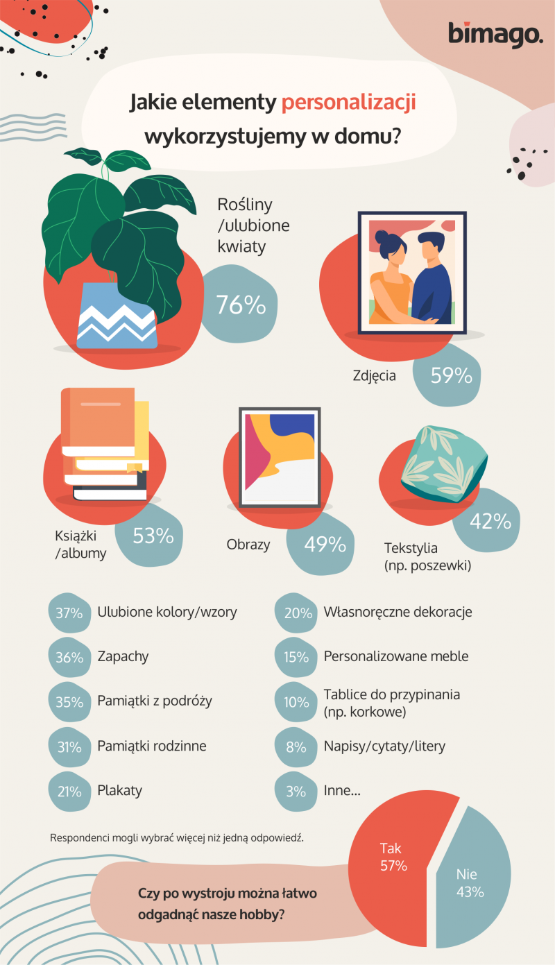 3/4 ankietowanych Polaków do personalizacji wnętrz wykorzystuje rośliny. Tuż za ulubionymi kwiatami plasują się zdjęcia: fotografie przedstawiające ważne dla mieszkańców chwile stanowią stały element aranżacji w blisko 6 na 10 domach. W głównej mierze poszukujemy więc kontaktu z naturą i wspomnieniami, które tworzą nasze życiowe historie.