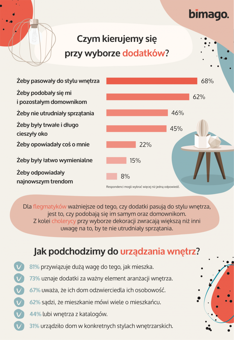 Dane pochodzą z badania przeprowadzonego w kwietniu 2021 roku. Zostało ono wykonane metodą CAWI (ankieta w formie elektronicznej) na próbie 1055 osób. Wszystkie wnioski z uzyskanych odpowiedzi znajdują się w artykule na blogu Bimago: Co mówią o Polakach ich domy? Tak personalizujemy wnętrza