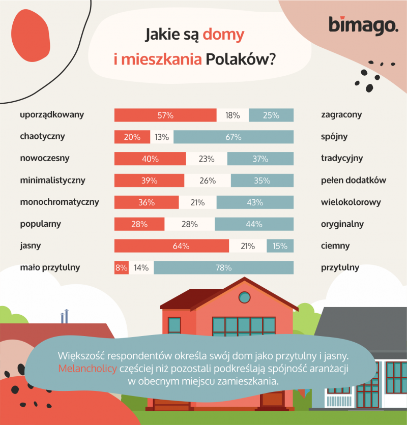 Najlepiej czujemy się w domu, w którym panuje odpowiedni klimat, sprawiający, że możemy się zrelaksować i poczuć jak u siebie. Niemal 80% ankietowanych Polaków opisuje swoje wnętrza jako przytulne. Ważna jest dla nas również spójność aranżacji (67%), pozwalająca na uniknięcie chaosu w domowym zaciszu. Dbamy przy tym o porządek – 57% badanych deklaruje, że mieszka schludnie.