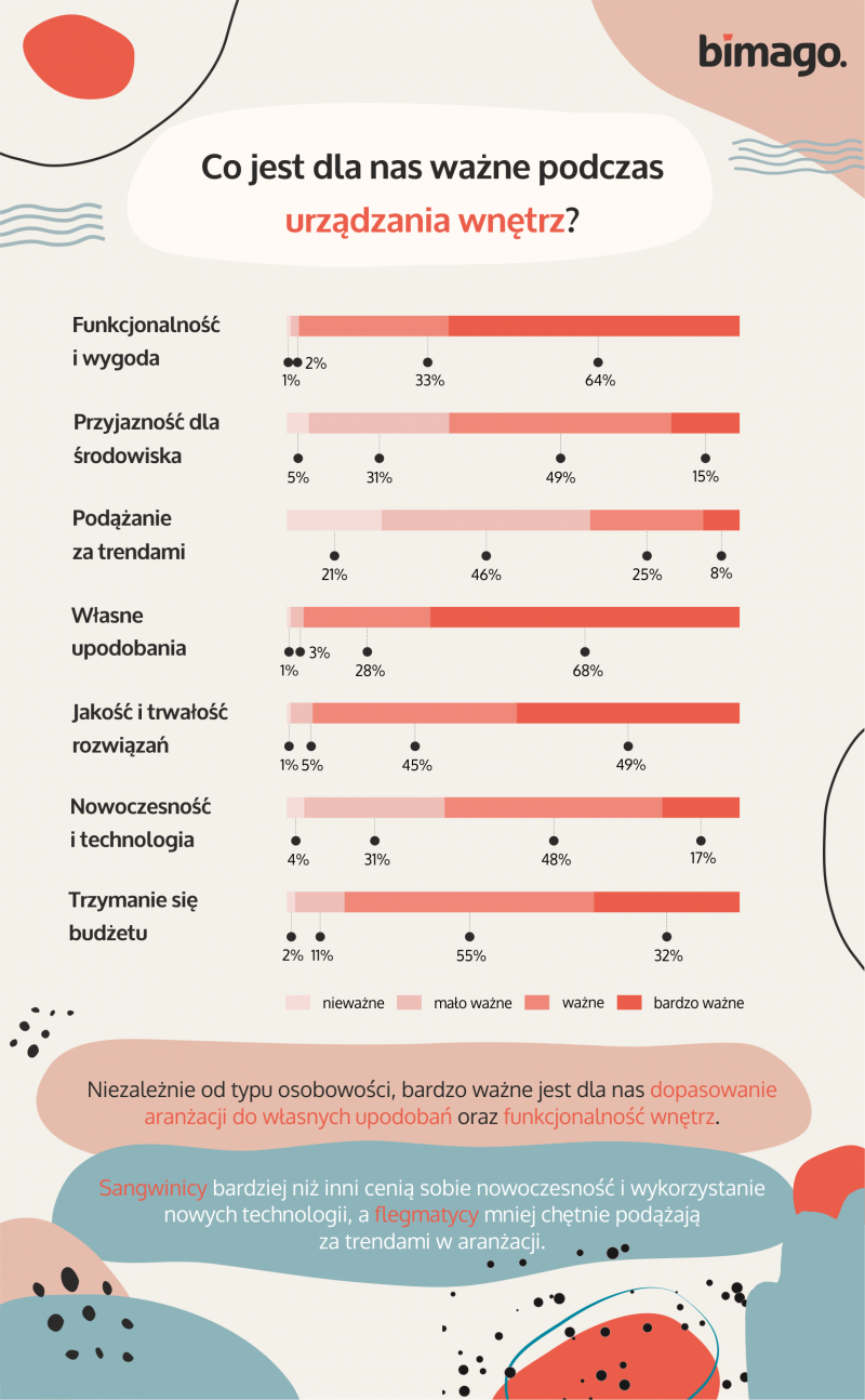 Badani Polacy przypisują również dużą wagę do jakości przedmiotów, wraz z którymi budują swoją osobistą przestrzeń: trwałość wpływa na wybór wyposażenia u 94% przepytanych osób. Przy urządzaniu wnętrz z tyłu głowy mamy także granicę w postaci zaplanowanego budżetu: ustalonymi wcześniej ramami finansowymi kieruje się 9 na 10 ankietowanych. Nie zapominamy również o postępującej technologii – 65% z nas deklaruje, że stawia na nowoczesne rozwiązania.
