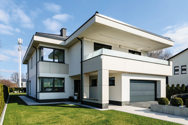 Proste linie, dach o niewielkim kacie nachylenia, duże przeszklenia i geometryczne kształty. Prostota formy oraz estetyka dająca wrażenie elegancji i funkcjonalności. Biel i szarość elewacji podkreśla nowoczesny charakter budynku, odbija nadmiar energii słonecznej zapewniając komfortowe warunki wewnątrz pomieszczeń. Czarne oblachowanie okien fasadowych FAKRO INNOVIEW dodaje domowi charakteru i elegancji. Połączenie drewna i aluminium to gwarancja trwałości oraz wysokiej estetyki. Okna wyposażone w pakiet trzyszybowy to zwiększona izolacyjność termiczna i akustyczna, która zapewnia doskonałe warunki wewnątrz budynku.