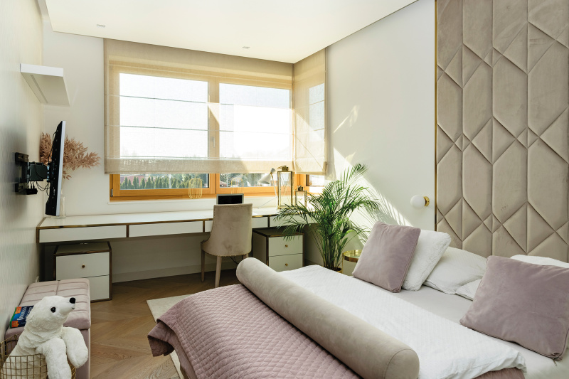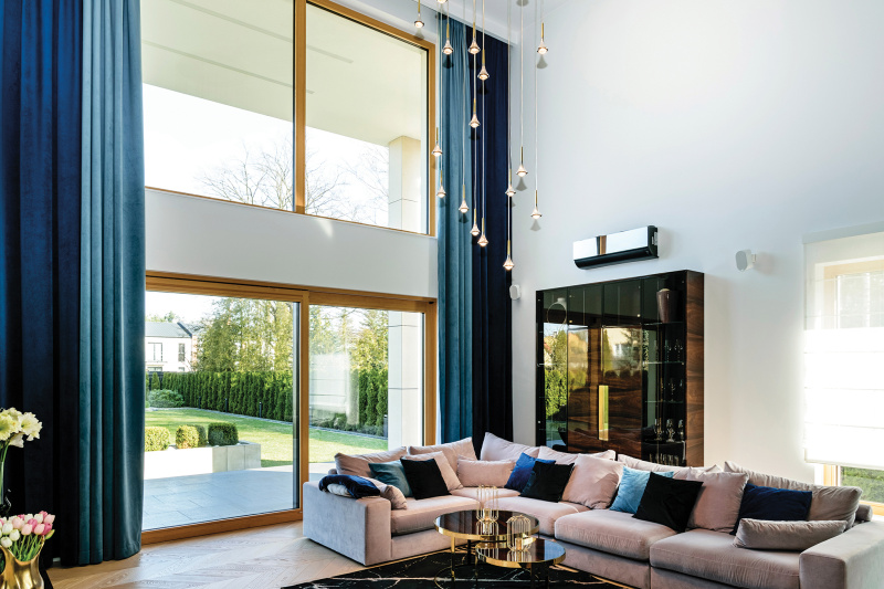 Dwuskrzydłowe drzwi tarasowe FAKRO HS stworzyły harmonijne połączenie między wnętrzem a otoczeniem. Wyposażone w nowoczesne mechanizmy, umożliwiają łatwe otwieranie i zamykanie, a także regulację przepływu powietrza. Właścicielom zależało na przestronnym i funkcjonalnym salonie, doświetlonym naturalnym światłem. Zamontowane nad drzwiami tarasowymi okna pionowe FAKRO INNOVIEW tworzą efektowną kompozycję i otwierają perspektywę na przestronny ogród. Duże przeszklenia wpuszczają obfitą ilość naturalnego światła do wnętrza, optycznie powiększając przestrzeń. Intensywne i jednocześnie szlachetne kolory sąsiadują z geometryczną formą mebli. Styl glamour przeplata się z tu z różnymi elementami w nowoczesnym wydaniu. Sosnowe ramy okienne dodają ciepła i organiczności, idealnie wpisując się w eklektyczną aranżację salonu. Równie kunsztowny efekt dadzą ramy okienne wykonane z drewna dębowego lub egzotycznego – meranti. Producent umożliwia dobór koloru ramy z pełnej palety RAL, w dwóch typach połysku – matowym oraz satynowym. Także kształt profilu drewna jest kwestią preferencji klienta. Właściciel domu w Markach zdecydował się na wariant Regular – prosty i nowoczesny. Alternatywą jest profil Classic – z lekkim 12° skosem i łagodną linią.