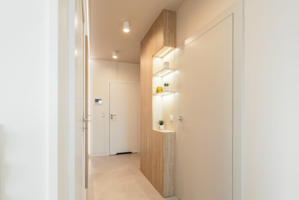 Estetyka projektu oscyluje wokół nurtu soft modern – w ciepłej, piaskowej tonacji i subtelnych kontrastach faktur. Dominują miękkie odcienie beżu, off-white oraz ciepłe drewno. Forma nie konkuruje tu z funkcją – to detale, struktury i niuanse kolorystyczne budują charakter wnętrza. Fornirowane zabudowy, strukturalne płytki imitujące kamień oraz wielkoformatowe powierzchnie tworzą spójną, sensoryczną kompozycję, która oddziałuje nie tylko wizualnie, ale i dotykowo.