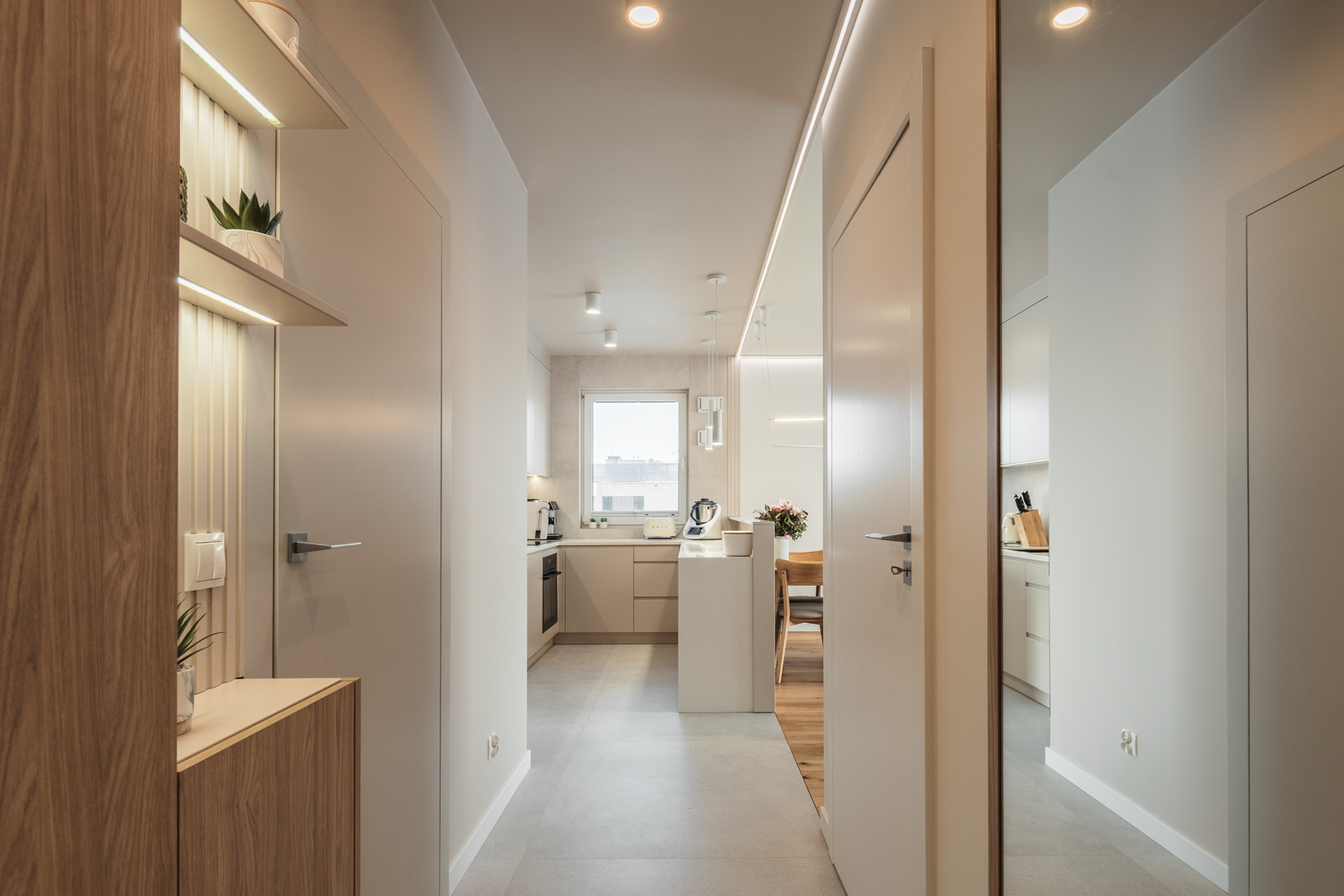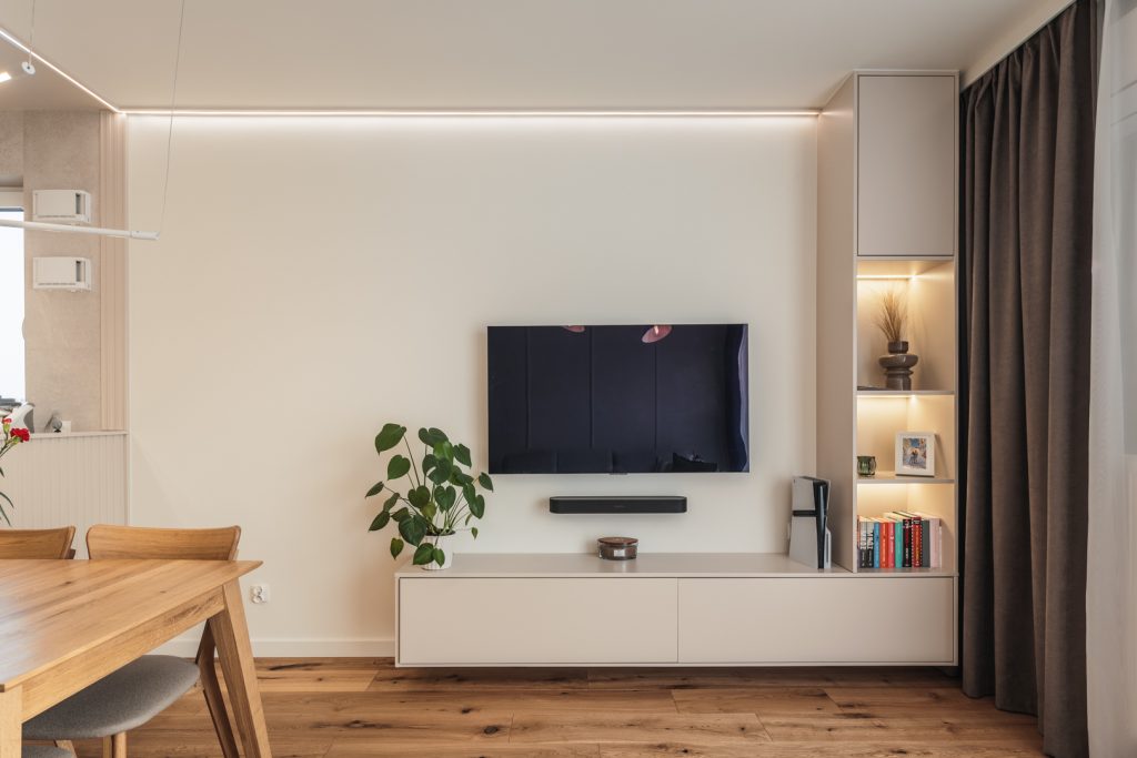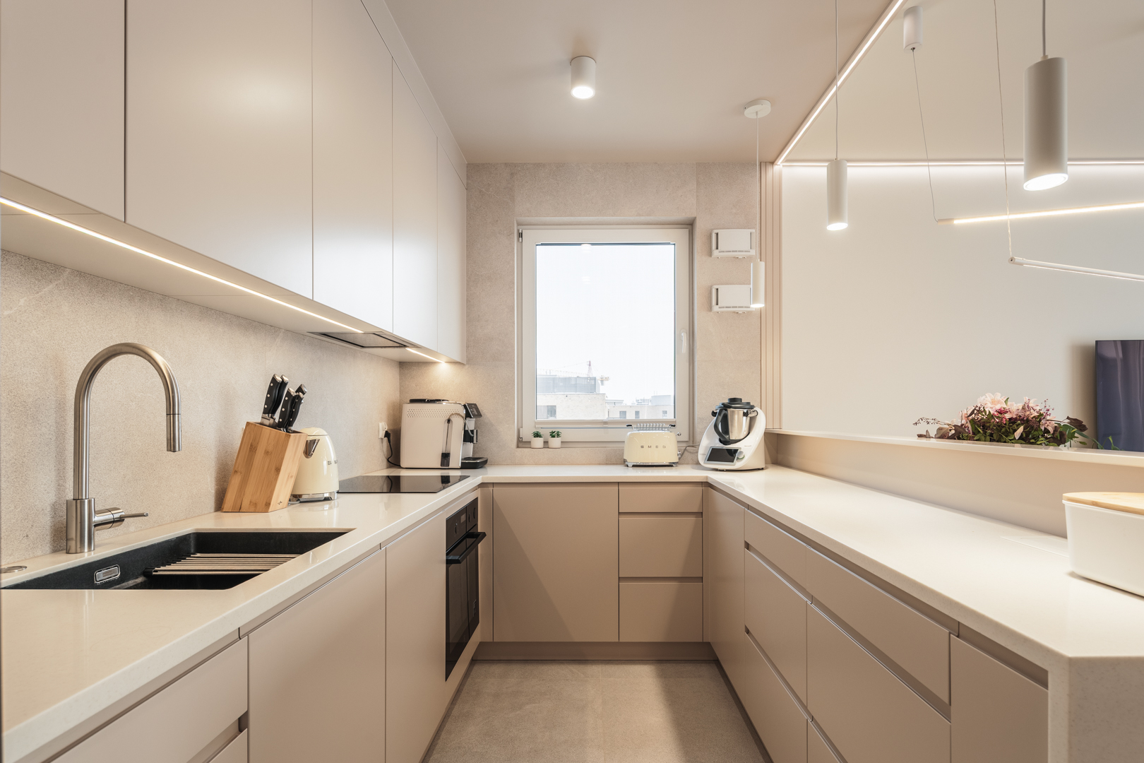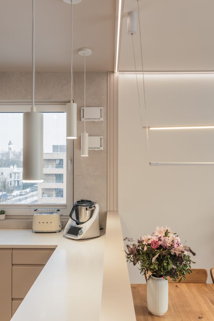 Centralnym punktem mieszkania jest otwarta strefa dzienna. Kuchnia w kolorze piaskowego beżu stanowi naturalne przedłużenie przedpokoju i korytarza – zarówno pod względem kolorystyki, jak i kompozycji linii. Zmiana koloru sufitu oraz listwa LED poprowadzona od wejścia aż po strefę telewizyjną porządkują przestrzeń i subtelnie wyznaczają granice funkcjonalne. Salon, utrzymany w jaśniejszych tonach, z dużym narożnikiem i domowym kinem, pełni rolę miejsca spotkań i wspólnego odpoczynku. Białe oprawy oświetleniowe delikatnie kontrastują z beżową bazą, podkreślając architekturę wnętrza.