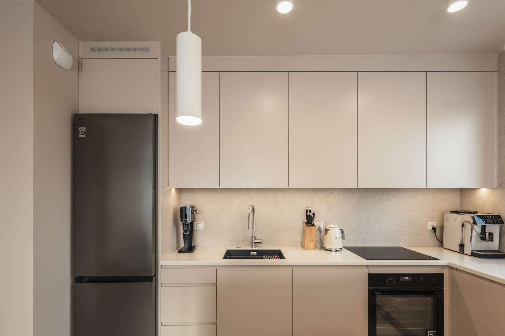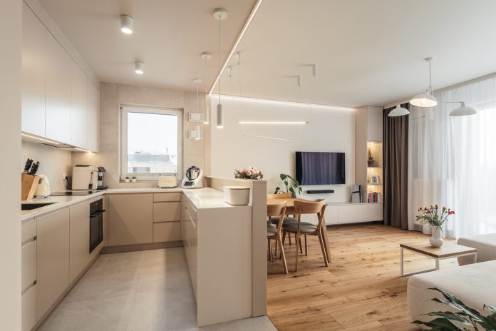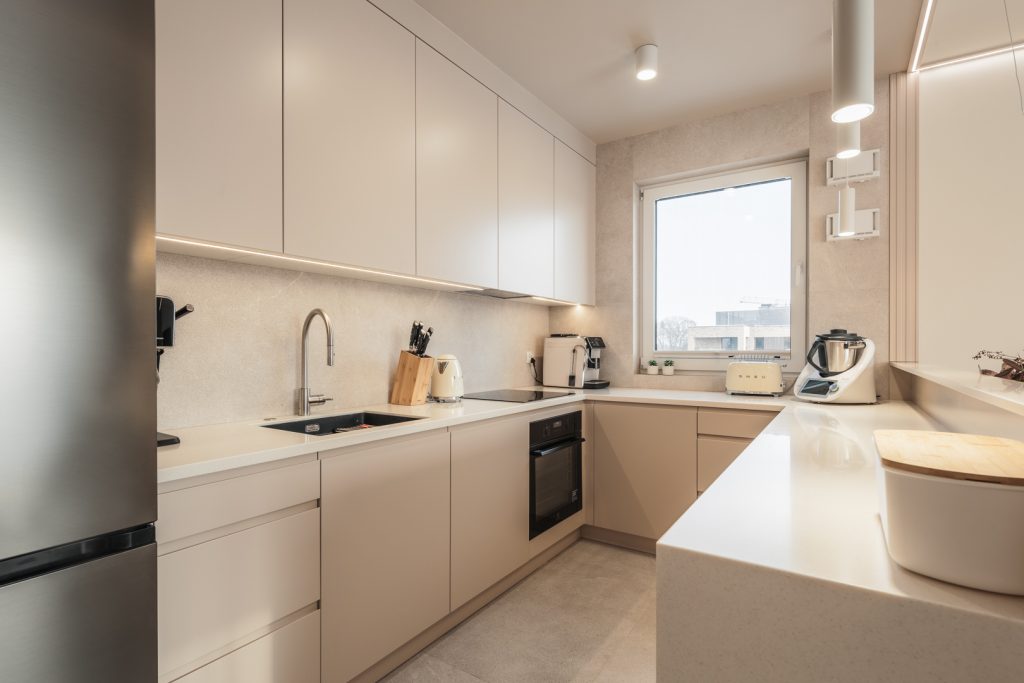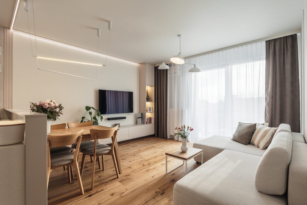 Centralnym punktem mieszkania jest otwarta strefa dzienna. Kuchnia w kolorze piaskowego beżu stanowi naturalne przedłużenie przedpokoju i korytarza – zarówno pod względem kolorystyki, jak i kompozycji linii. Zmiana koloru sufitu oraz listwa LED poprowadzona od wejścia aż po strefę telewizyjną porządkują przestrzeń i subtelnie wyznaczają granice funkcjonalne. Salon, utrzymany w jaśniejszych tonach, z dużym narożnikiem i domowym kinem, pełni rolę miejsca spotkań i wspólnego odpoczynku. Białe oprawy oświetleniowe delikatnie kontrastują z beżową bazą, podkreślając architekturę wnętrza.