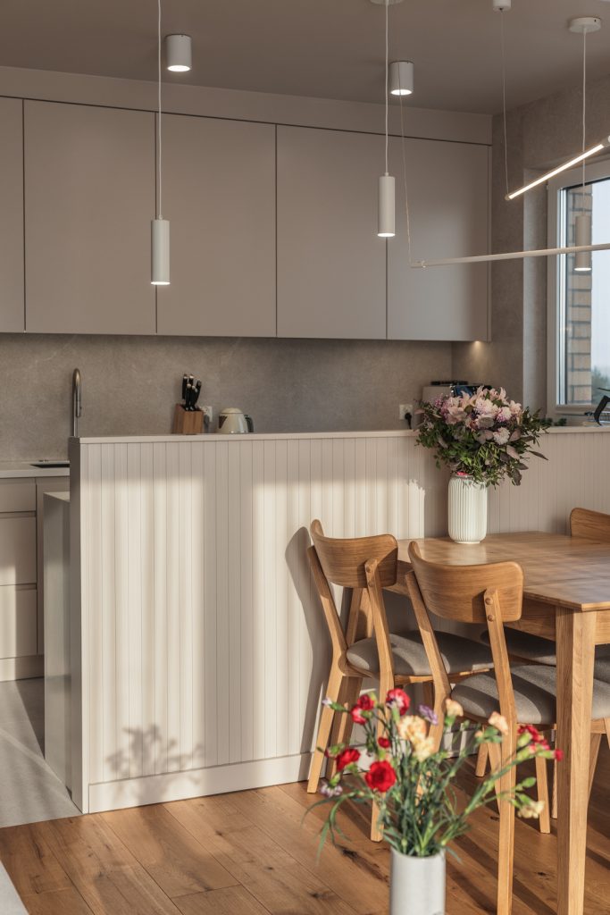 Wnętrze powstało z myślą o codziennym komforcie dwóch osób, dla których dom jest zarówno miejscem życia, jak i pracy. Kluczowe były: duża powierzchnia robocza w kuchni, wizualne oddzielenie jej od salonu oraz maksymalne wykorzystanie przestrzeni do przechowywania. Ważnym założeniem było także stworzenie dwóch niezależnych stanowisk pracy w osobnych pomieszczeniach – bez utraty wrażenia lekkości i przestronności.