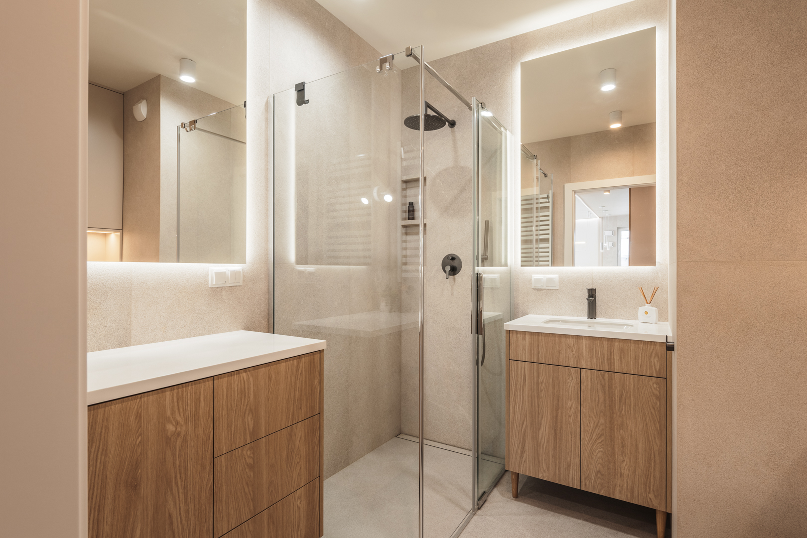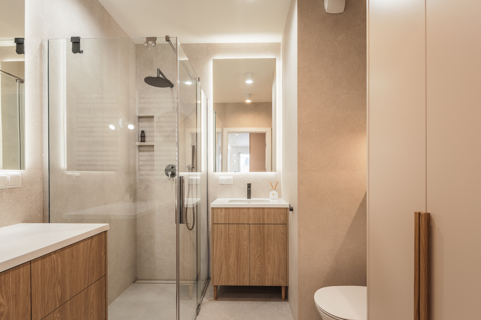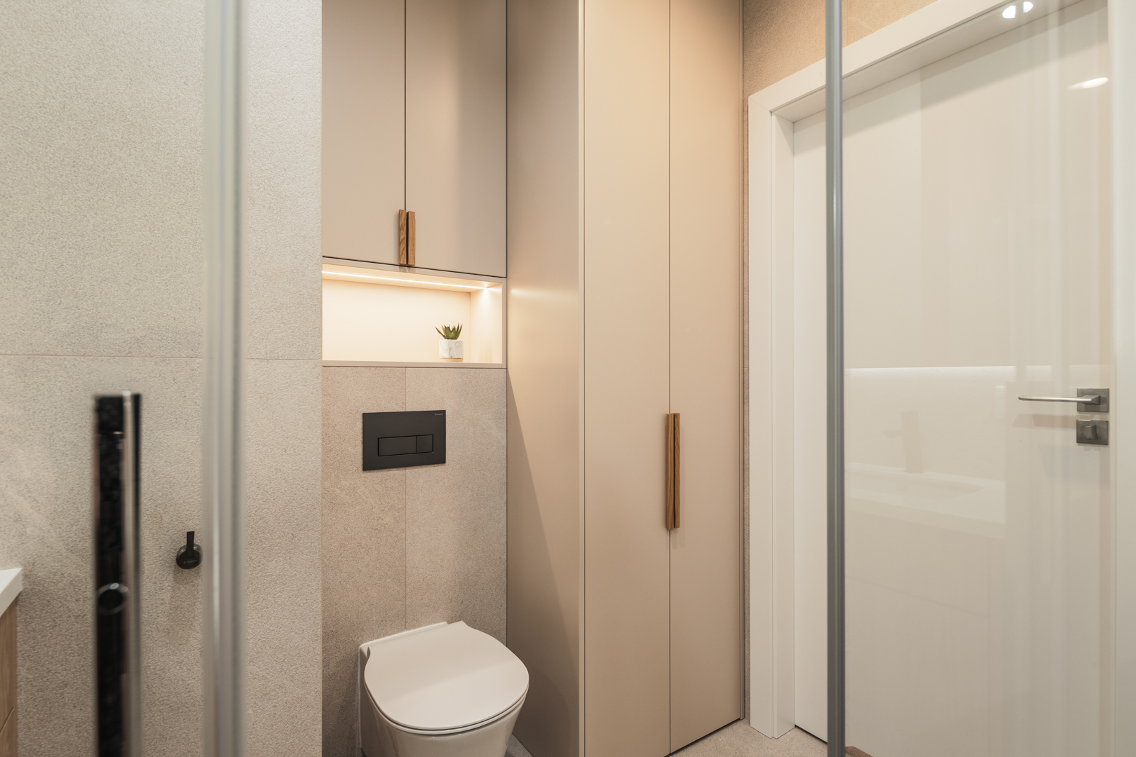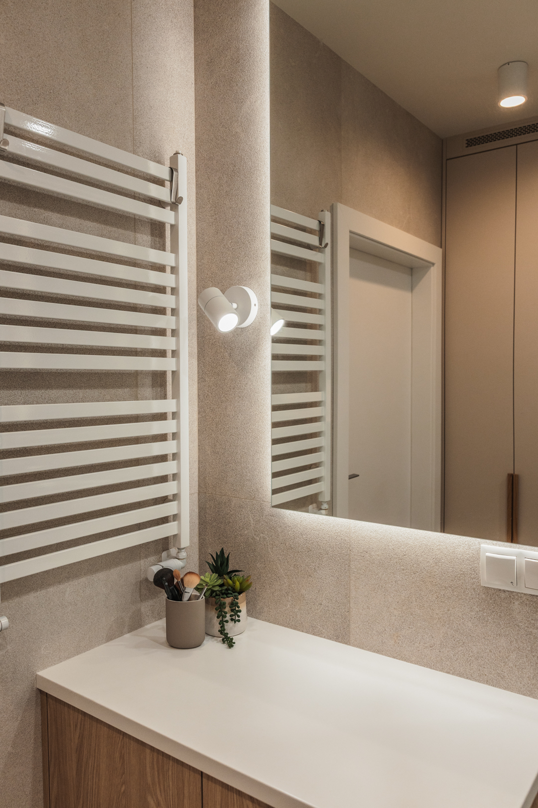 Łazienka została zaprojektowana jako prywatna strefa spa. Oprócz przestronnego prysznica i rozbudowanej zabudowy z ukrytą pralką oraz suszarką, znalazło się tu także osobne stanowisko do makijażu z dedykowanym oświetleniem. Rozproszone światło przy lustrach równomiernie doświetla twarz, podnosząc komfort codziennych rytuałów. Spójność materiałowa – te same płytki w całym mieszkaniu – dodatkowo wzmacnia wrażenie harmonii.