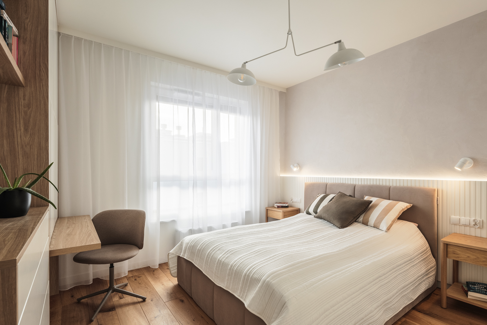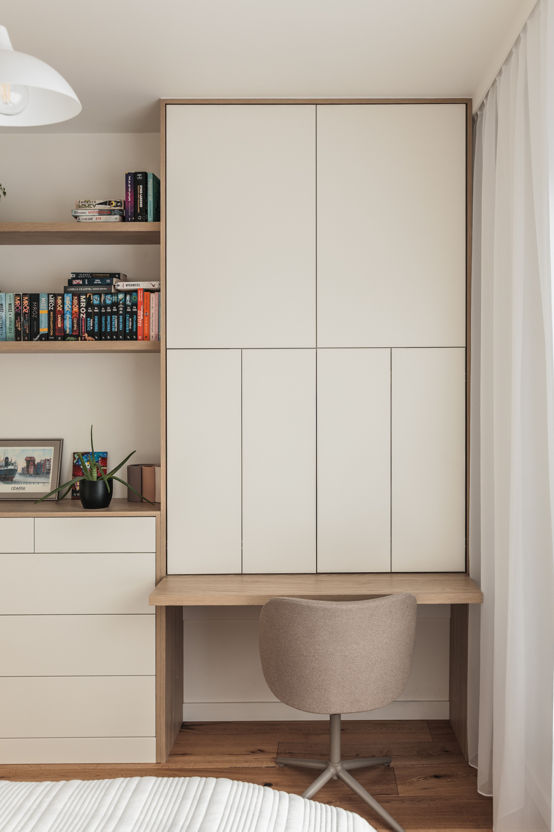 Sypialnia łączy funkcję miejsca wypoczynku z przestrzenią do pracy. W miejscu klasycznej toaletki zaplanowano pełnowymiarowe biurko, które można zamknąć za składanymi frontami, symbolicznie oddzielając życie zawodowe od prywatnego. Tapicerowane łóżko stanęło na tle ściany o warstwowej strukturze – z pionową okładziną i podkreślającym jej fakturę oświetleniem LED. Całość dopełnia pojemna szafa z drzwiami przesuwnymi.
