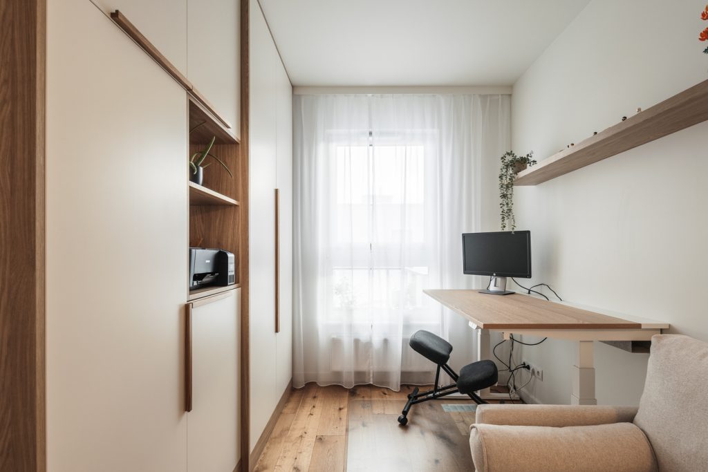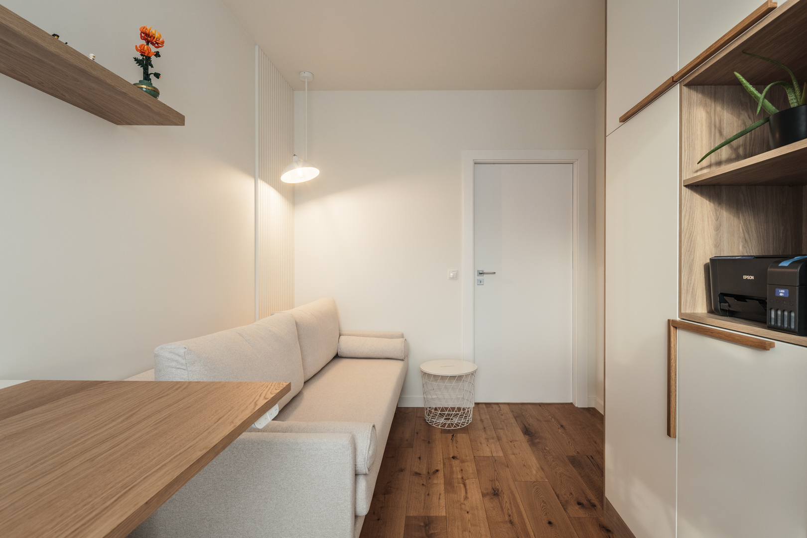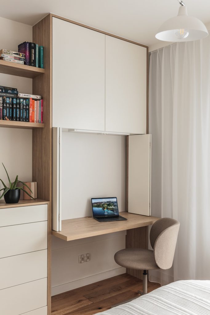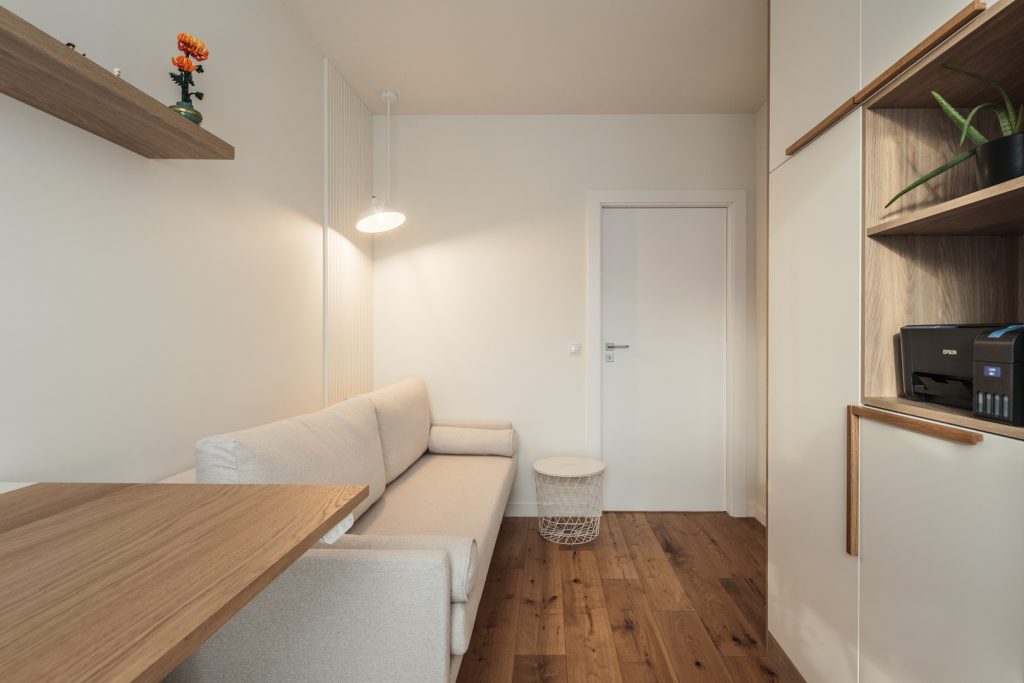 Kolejne pomieszczenie pełni funkcję biura i pokoju gościnnego. Regulowane biurko zapewnia ergonomię pracy, a rozkładana sofa umożliwia komfortowe przyjęcie gości. W mieszkaniu mieści się również pomieszczenie porządkowe, które pozwala utrzymać ład w pozostałych strefach.