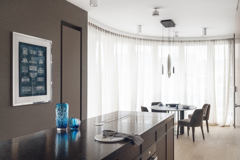 Elegancka część dzienna to duma projektantki. Jej stworzenie nie było proste, bo do dyspozycji była długa i dość wąską przestrzeń. Jednak tę z pozoru wadę udało się przekuć w zaletę. „Mankamenty” podpowiedziały architektce ciąg aranżacyjnych rozwiązań. Dosłownie „ciąg”, bo poszczególne strefy następują tu kolejno po sobie. Kuchnia z dużą wyspą została sprytnie połączona z jadalnią. Zabudowa meblowa w pięknym kolorze mocno rozbielonej kawy została zrobiona na zamówienie. Gładkie fronty szafek tworzą spójną, monolityczną bryłę z niewielką niszą, w której ukryto tzw. strefę mokrą. Mocniejszym akcentem w kuchni jest duża wyspa fornirowana ciemnym drewnem harmonizującym ze stołem jadalnym (Lagerform). Salonowy charakter części kuchennej podkreśla efektowna lampa nad wyspą – Cosmos czyli kultowy już projekt hiszpańskiej marki Vibia. Tuż za stołem, za przeszkloną zamykaną ścianą udało się wygospodarować miejsce na gabinet. Kuchnia płynnie łączy się z salonem. Wygodne sofy (Arketipo) tworzą idealne miejsce do odpoczynku. Tu cała rodzina uwielbia oglądać wspólnie filmy. Klamrą spinającą z obu stron całą przestrzeń są ściany wykończone po łuku, z dużymi oknami. Dzięki nim do salonu wpada mnóstwo światła, w dodatku z trzech kierunków (bo ściana w kuchni również ma wysokie okna), dlatego od rana do wieczora jest tu bardzo jasno.