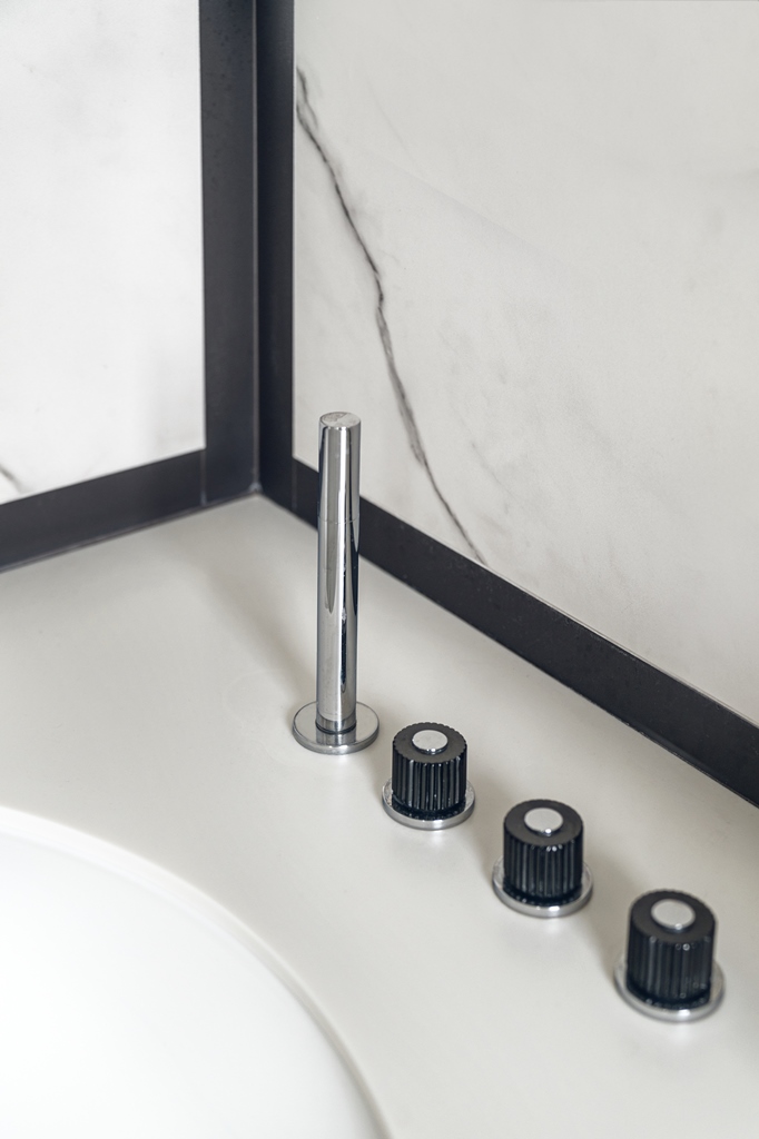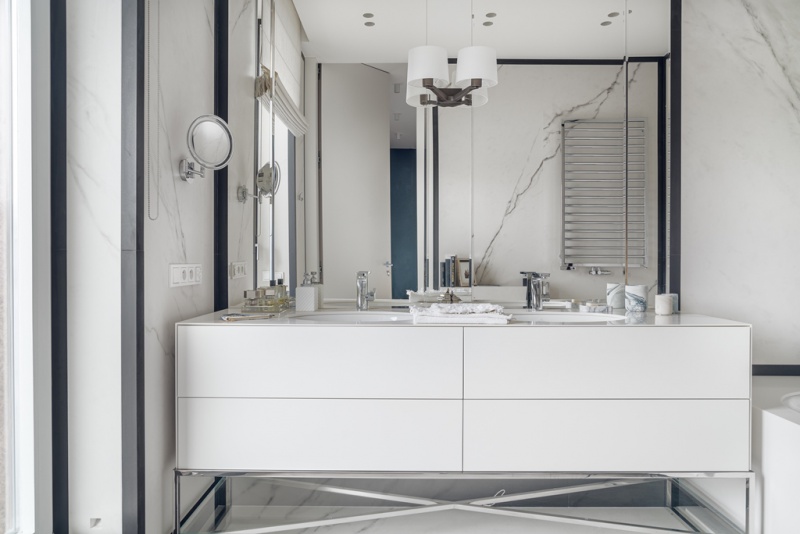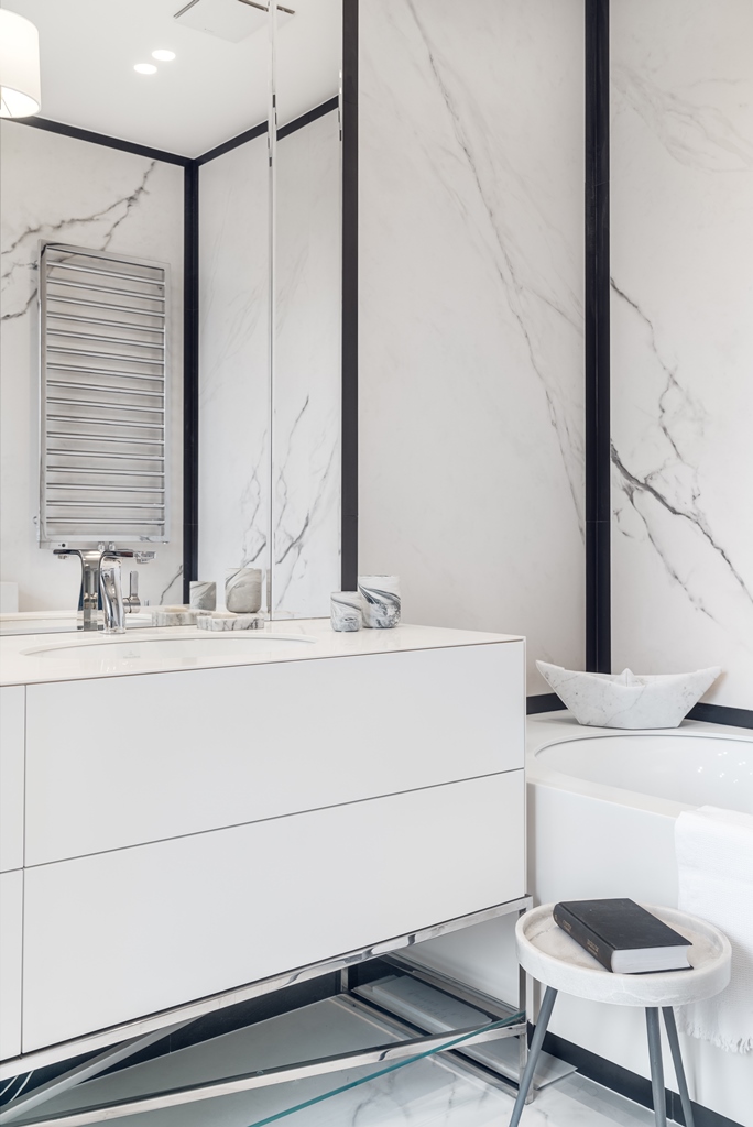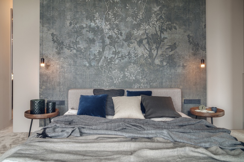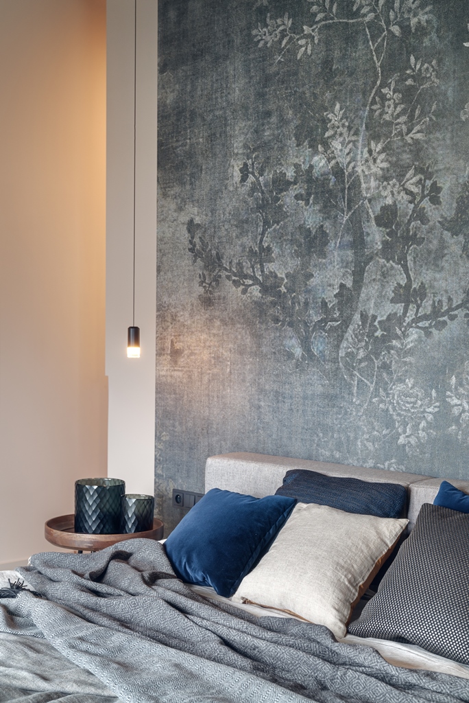 Drugim oczkiem w głowie architektki jest sypialnia gospodarzy. Jak mówi projektantka „rodem ze snu nocy letniej”. Jej wystrój w udany sposób łączy kobiece upodobania z męskim punktem widzenia. Na tle tapety w botaniczne motywy stanęło duże wygodne łóżko (NAP), a po obu stronach symetrycznie ustawione stoliki nocne. Nad nimi projektantka powiesiła dyskretne lampki marki Vibia. Tuż obok sypialni, za idealnie zlicowanymi ze ścianą, prawie niewidocznymi drzwiami, znajduje się łazienka właścicieli. Nowoczesna, w detalach nawiązująca do nowojorskich wnętrz. Jasna kolorystyka białych marmurowych płyt z pięknym szarym żyłkowaniem odcina się od czarnych profili. Wanna została schowana w ceramiczną zabudowę. Nowoczesnym akcentem jest prosty mebel, a la komoda, z wpuszczoną w cieniutki blat umywalką. Unosi się lekko nad podłogą na nogach z nierdzewnej stali.