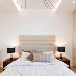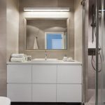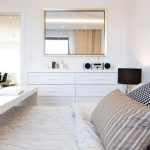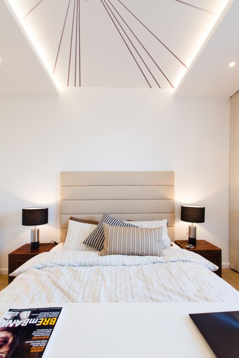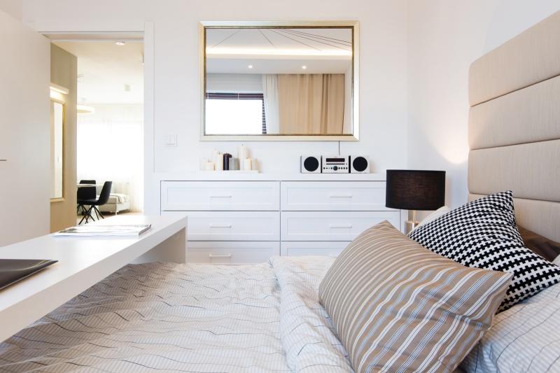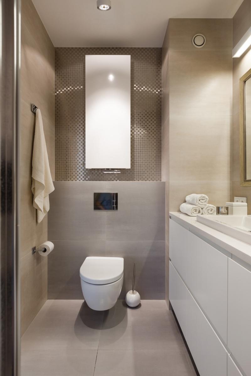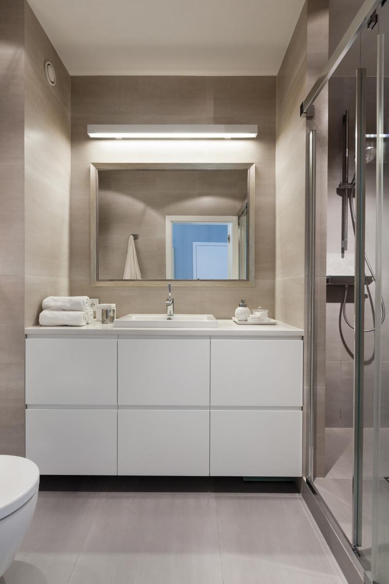 Założeniem projektowym była aranżacja wnętrza w stylu nowoczesnym i eleganckim, z klasycznymi elementami, które sprawdzą się w każdym wnętrzu pomimo upływu czasu. I tak w mieszkaniu znalazły się trzy niemalże identyczne lustra – w zależności od funkcji, jaką mają spełniać, ich wymiary i proporcje są różne, rama zaś niezmienna. Lustro w przedpokoju pozwala na przygotowanie się do wyjścia, to w łazience pomaga w codziennej higienie, a lustro w sypialni, które zawisło nad równie klasyczną komodą, ma za zadanie optycznie powiększyć tę stosunkowo niewielką przestrzeń. Obecność dodatkowego pomieszczenia, jakim jest garderoba, pozwoliła na zrezygnowanie w sypialni z dużej szafy na ubrania. Dzięki jej sporym gabarytom udało się tam umieścić również pralkę i odciążyć w ten sposób łazienkę. Na pozór zwyczajna, niczym niewyróżniająca się łazienka zaskakuje funkcjonalnością i dbałością o wykończenie detalu. Duży prysznic, wygodny kamienny blat, sporo miejsca do przechowywania niezbędnych przyborów, metalowa mozaika, która w połączeniu z minimalistycznym grzejnikiem wygląda jak geometryczny obraz – wszystko to sprawia, że wartość zaprojektowanej przestrzeni znacznie wzrasta.