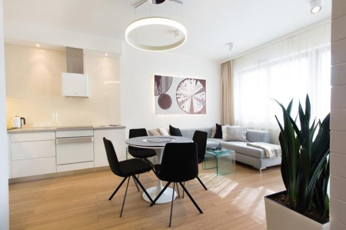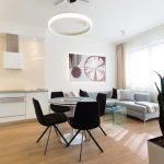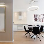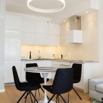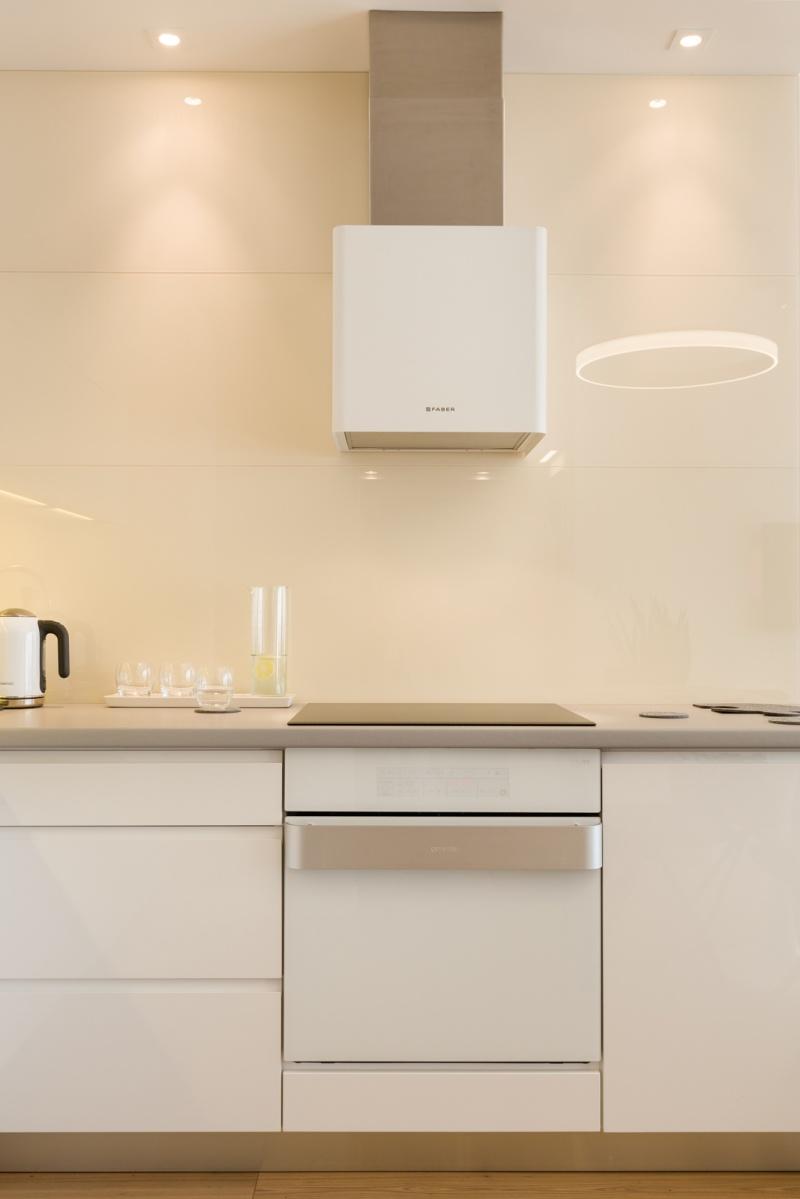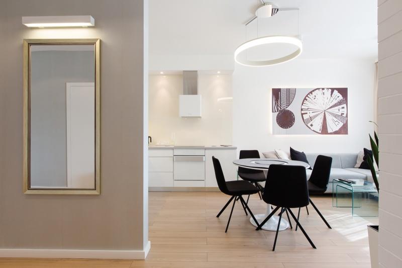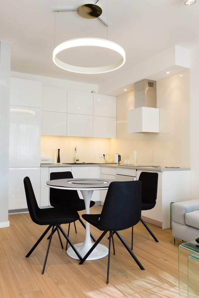 Ten 63-metrowy apartament składa się z przestronnej strefy wejściowej, prowadzącej nas do stosunkowo niewielkiej, otwartej przestrzeni dziennej, w skład której wchodzą aneks kuchenny, centralnie usytuowany okrągły stół oraz wypoczynek w formie narożnika. Subtelną granicę pomiędzy aneksem kuchennym a częścią wypoczynkową stanowi linia, która została wyznaczona w miejscu, gdzie swój koniec znajduje blat kuchenny. Dzięki zastosowaniu szkła, na całej wysokości ściany nad meblami kuchennymi, uzyskujemy klarowny podział otwartej przestrzeni. Najważniejszym elementem tego wnętrza jest niewielki okrągły stół, przy którym ustawione zostały cztery oszczędne w formie, nowoczesne krzesła. Ich dodatkowym atutem są obrotowe siedzenia, które w znacznym stopniu ułatwiają użytkowanie. Nad stołem swoje miejsce znalazła minimalistyczna lampa w formie obręczy. Jej kształt i wielkość harmonizuje z proporcjami stołu, a jej światło pada nie tylko na powierzchnię blatu, ale również oświetla całą przestrzeń wspólną, co sprawia, że jest ona sercem tego miejsca.