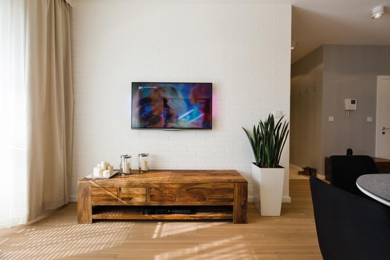 Wszechobecna biel w kontakcie z paletą beżów i szarości sprawia, że mieszkanie jest przestronne, lekkie i przyjemne w odbiorze, a dzięki czerni zastosowanej w akcentach, nabiera wyrazistości. Czarne dodatki określają charakter wnętrza, a ciepło drewna na podłodze wprowadza do środka pierwiastek natury. Ciekawe zastosowanie różnorodnych faktur i materiałów sprawia, że mieszkanie mimo swojej ujednoliconej kolorystyki nie jest nudne. Faktura białej cegły na ścianie świetnie komponuje się z szarą tapetą, której struktura przypomina szlachetną skórę. Szkło w kolorze ciepłego beżu stanowi natomiast wspaniałe dopełnienie białej lakierowanej kuchni. Nie zabrakło też miejsca dla przyjemnych w dotyku materiałów. Zasłony w oknach, poduszki na kanapach sprawiają, że odbieramy to miejsce w pozytywny sposób. Jedną z ważniejszych ról w tym wnętrzu odgrywa światło – zostało ono zaprojektowane tak, aby w zależności od potrzeb można było dostosować jego ilość i charakter. Każde z pomieszczeń wyposażone zostało w strumień światła głównego i nastrojowego, mniej intensywnego. Dzięki żaluzjom w oknach w sprawny sposób możemy okiełznać ilość światła dziennego wpadającego do środka.